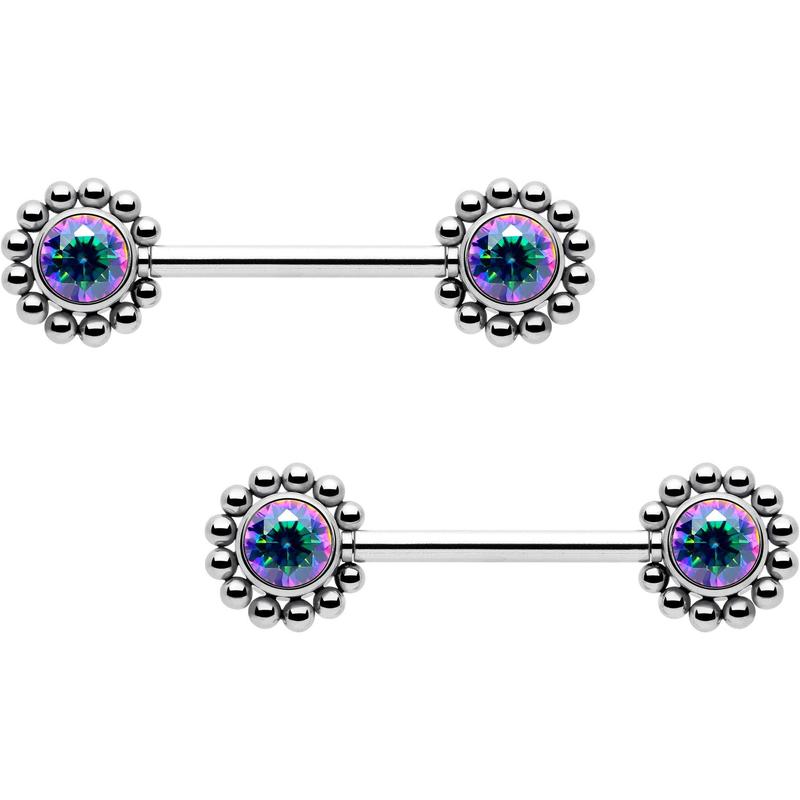 5. 14G 9/16 Vitrail CZ Gem Beaded Edge Threadless Barbell Nipple Ring Set
