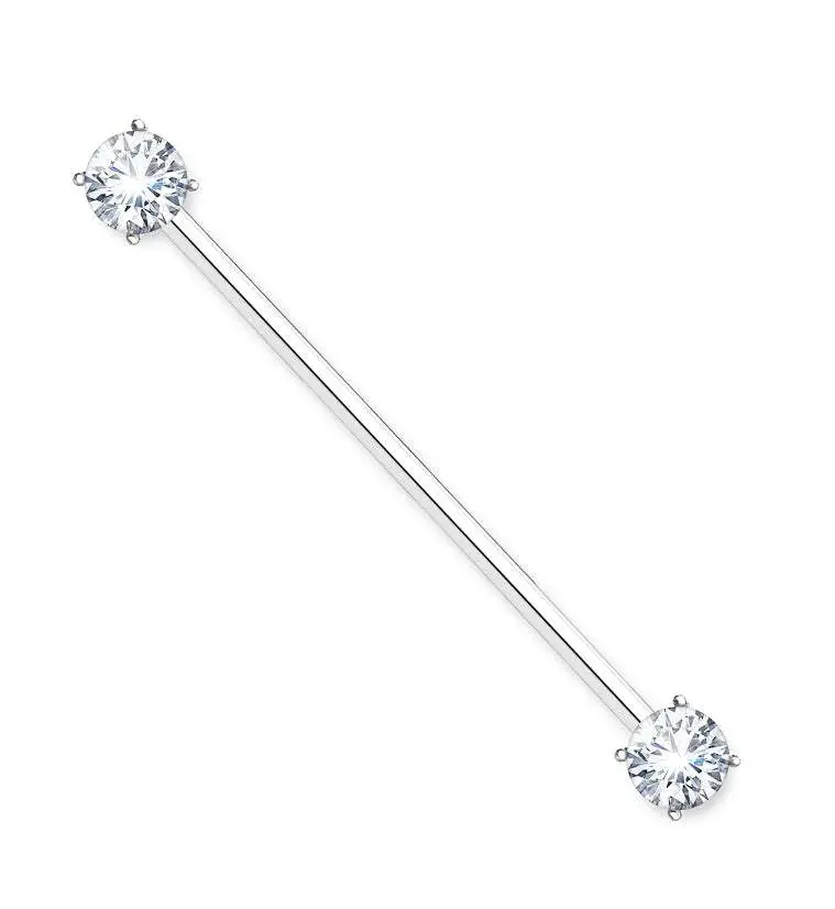 Turn heads with our silver double CZ industrial barbell! The 14g straight barbell is constructed from 316L stainless steel and measures 1 ½” total. Features external threading for simplicity and large 7mm cubic zirconia ends for sparkly charm!