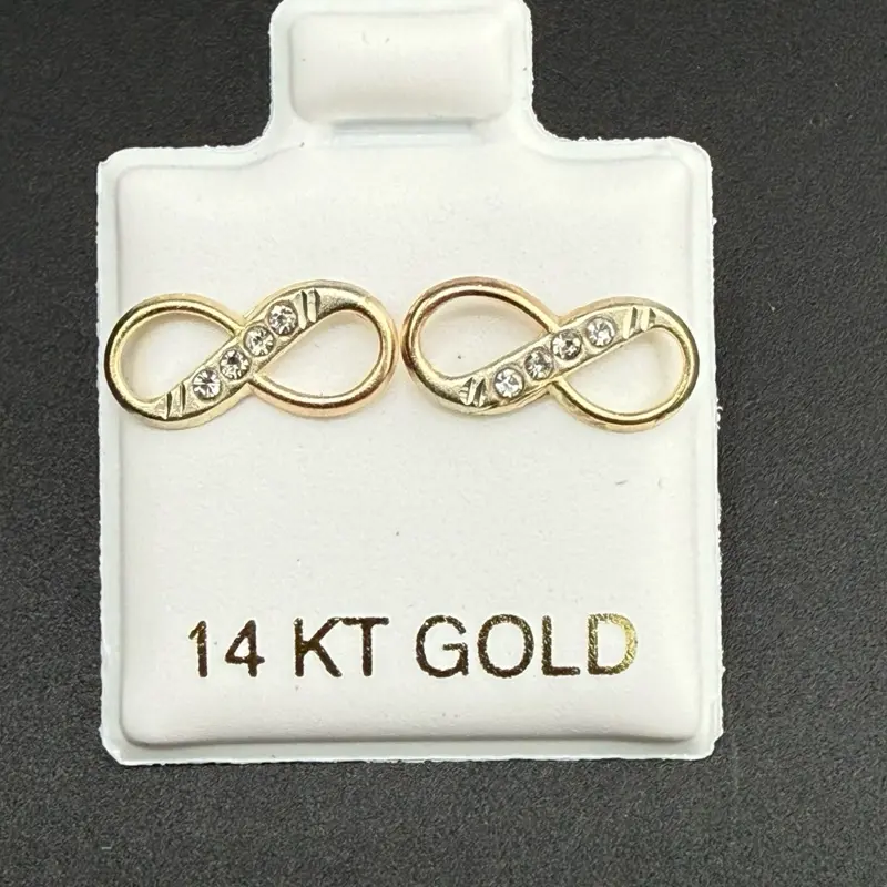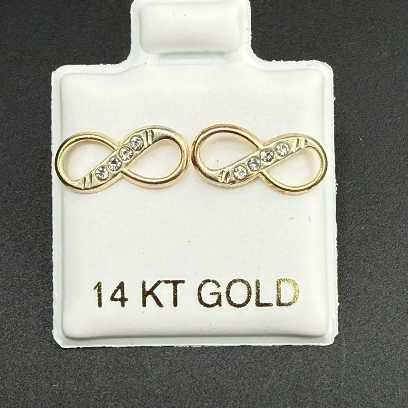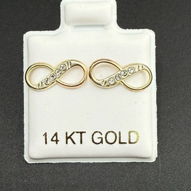 The image shows the 14k gold infinity earrings with sparkling CZ stones. The earrings are displayed on a white card. 🌟