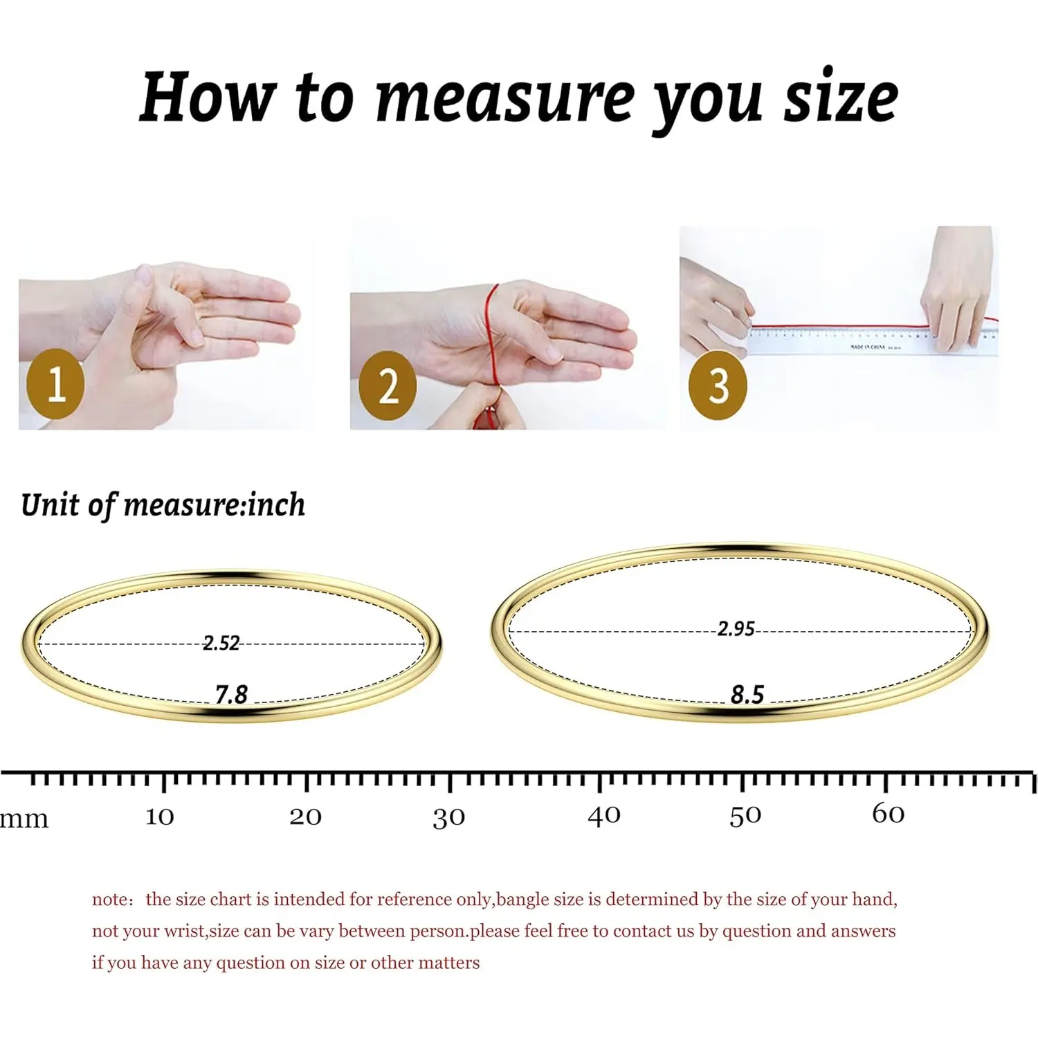 ·【To Ensure Proper Fit】 : Method1:Measure a bangle you already own to determine the inner diameter .Compare the measured data with the one we offered to get the right sized bangle . Method2 : Use string to wrap around your hand's widest part to determine thecircumference ( Typically the row of knuckles), mark where the string meets, then lay on ruler.