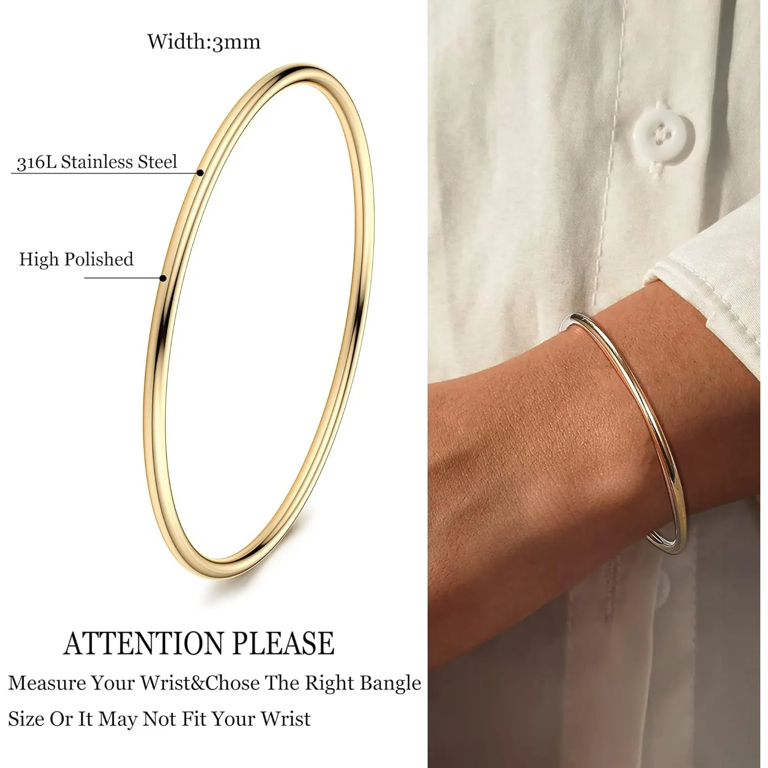 ·【Bangle Bracelets Size】bangle bracelets thickness: 3mm, inner diameter: 2.52 inches (64mm), 2.95 inches (75mm) available for choice,to ensure proper fit, please confirm your wrist size before buying, Please see pictures for measurement steps (PS: To ensure proper fit: Make fist and measure thickest part.)