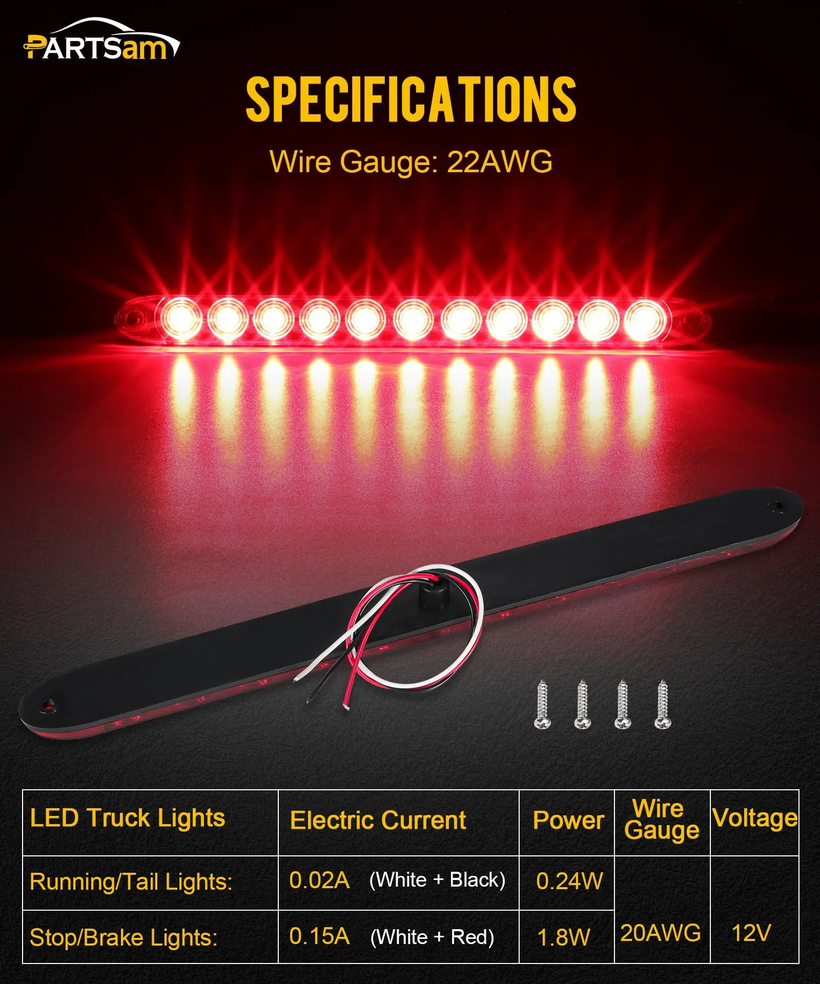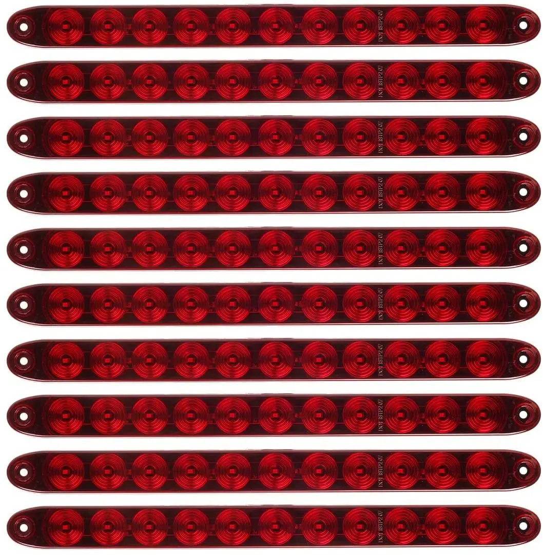 Package includes 10x 15 inch Red LED Trailer Tail Lights Bar. Thin, low-profile stop-turn-tail light bar combo, Each red light bar has 11 Super Diodes for a Bright Performance and can be mounted horizontally, vertically, or at an angle, slim design for use where space is a narrow. Note: Please save your two screws because the screws are not included with the new led tail light strip.