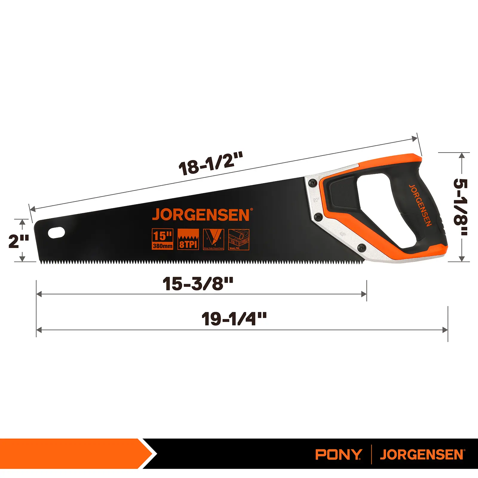 ·𝐅𝐚𝐬𝐭 𝐂𝐮𝐭𝐭𝐢𝐧𝐠: JORGENSEN 15” hand saw is great for woodworking. Equipped with 8 teeth per inch and 3 cutting edges, our wood saw is sharp and aggressive to cuts 50% faster, which is more professional and helps you to improve work efficiency. The cut edges are covered with a plastic protective sleeve which makes the handsaw safe to carry and store