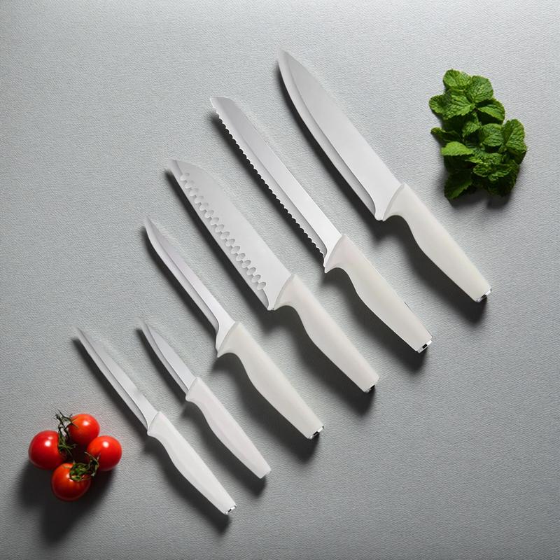 Premium Design -Our knife set (including cutting board) iscrafted from high-quality stainless steel to ensure precisionand user-friendliness. With a hardness of 48-53 HRC, itmaintains sharpness and retains an edge. The curved