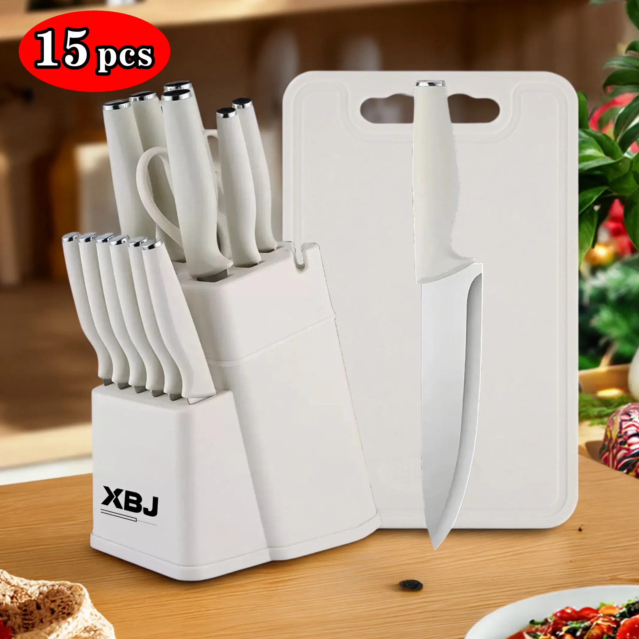 A complete knife set in one - This professional kitchen knifeset includes a 12.2-inch chef's knife, a 12.2-inch breadknife, an 1.4-inch Santoku knife, a 10.5-inch boning knife,a7.6-inch paring knife, a 9-inch all-purpose knife,six 8.7-inchserated steak knives, kitchen shears, a cutting board, and aknife block. This 15-piece black knife set includes a uniquecutting board, perfect for all your kitchen tasks.