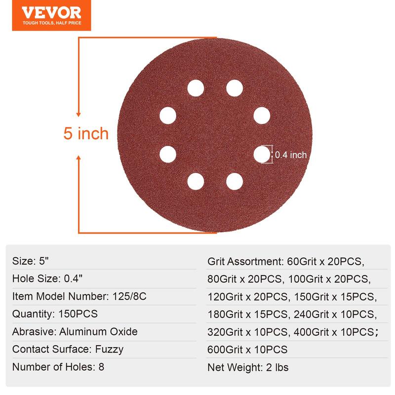 5. VEVOR 150 PCS 5 Inch Sanding Discs Set, TikTokShopBlackFriday, 8-Hole Round Hook and Loop Sandpaper for Orbital Sander, 10 Grits include 60, 80, 100, 120, 150,180, 240, 320, 400, 600 Grit, for Metal, Wood, Car Sanding