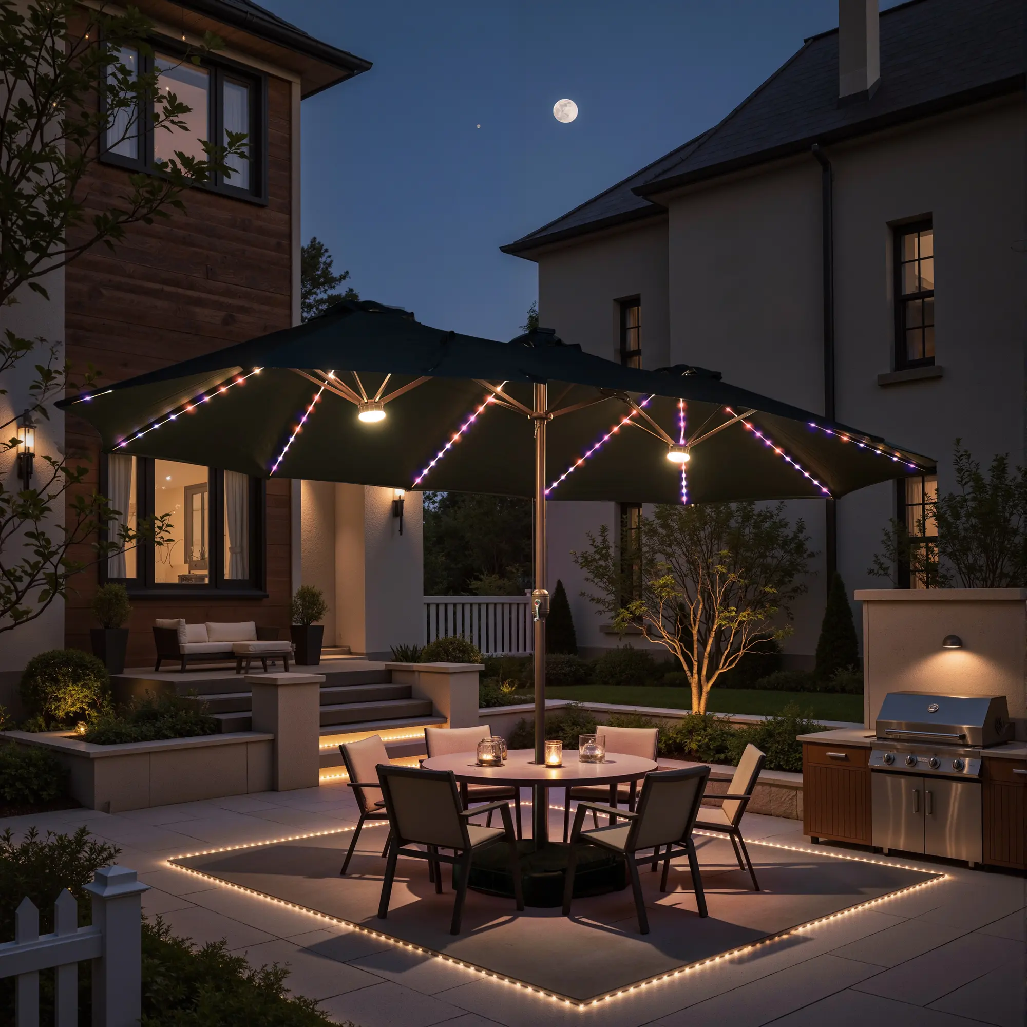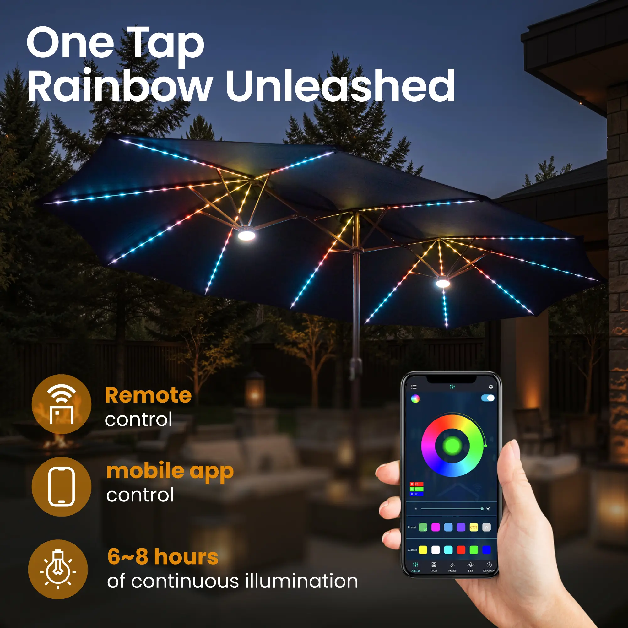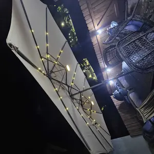 ·Illuminate Your Space: Our outdoor umbrella features cutting-edge LED lights. 36 LED light with 3 solar panels on top, no need to charge indoors enhance your romantic feel at night. The light switch is located on one of the 12 umbrella bones