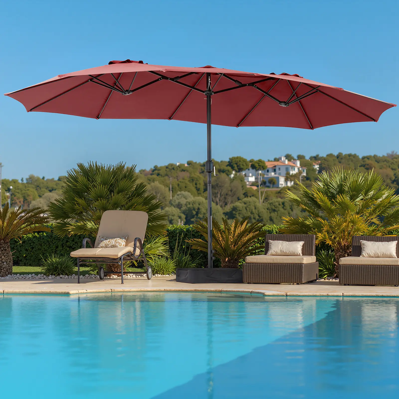 ·Base Included: The umbrella for patio purchase includes a durable umbrella base, two sandbags (excluding sand) and a cover cloth. NOTE: Use with an overall base weight of 132 pounds or more for stability.