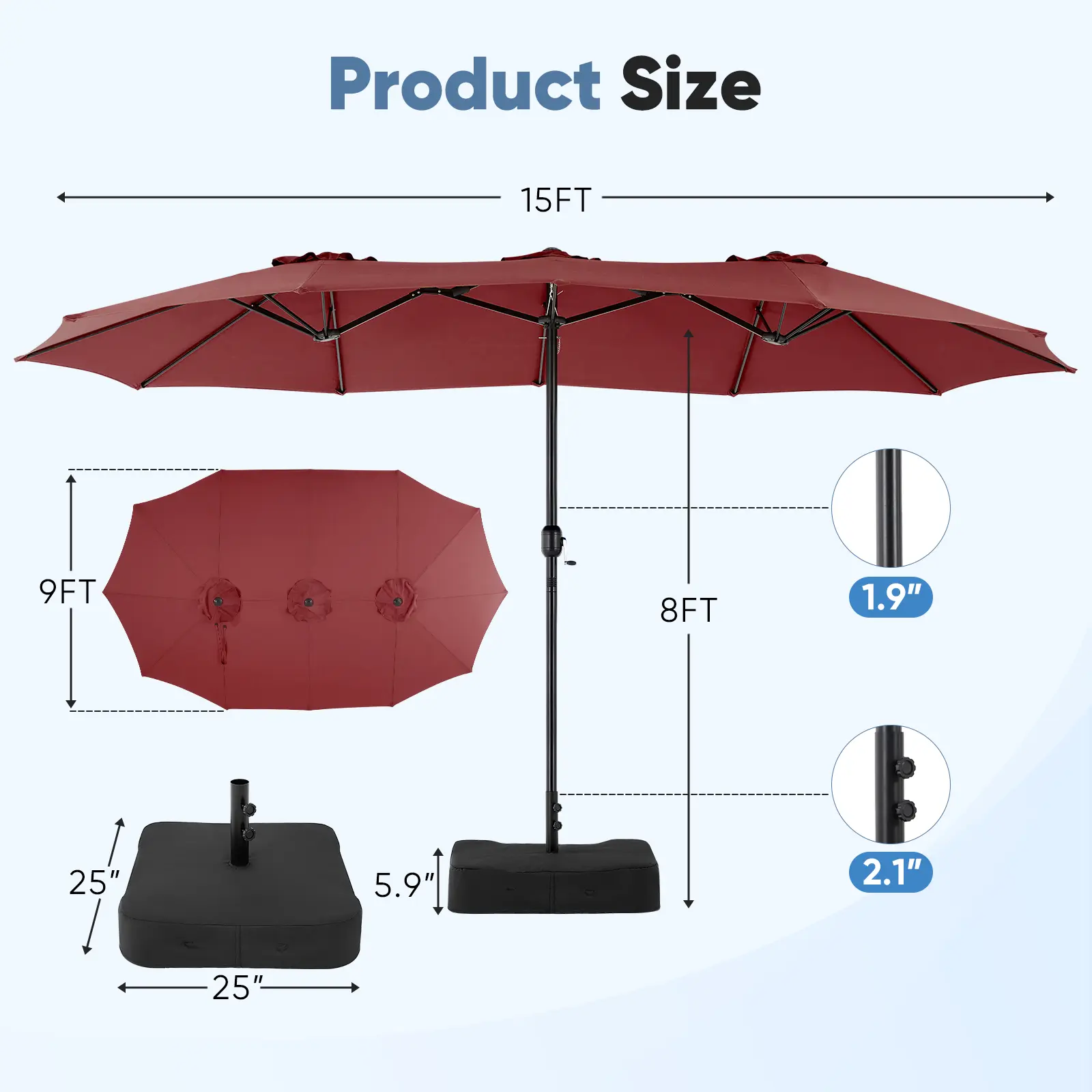 ·Size: The large umbrella outdoor patio pole diameter is 1.9 inches and the bottom pole diameter is 2.1 inches. The metal tube material is iron + scratch and rust resistant powder coated to ensure that our outdoor umbrellas are rust, corrosion and flaking resistant.