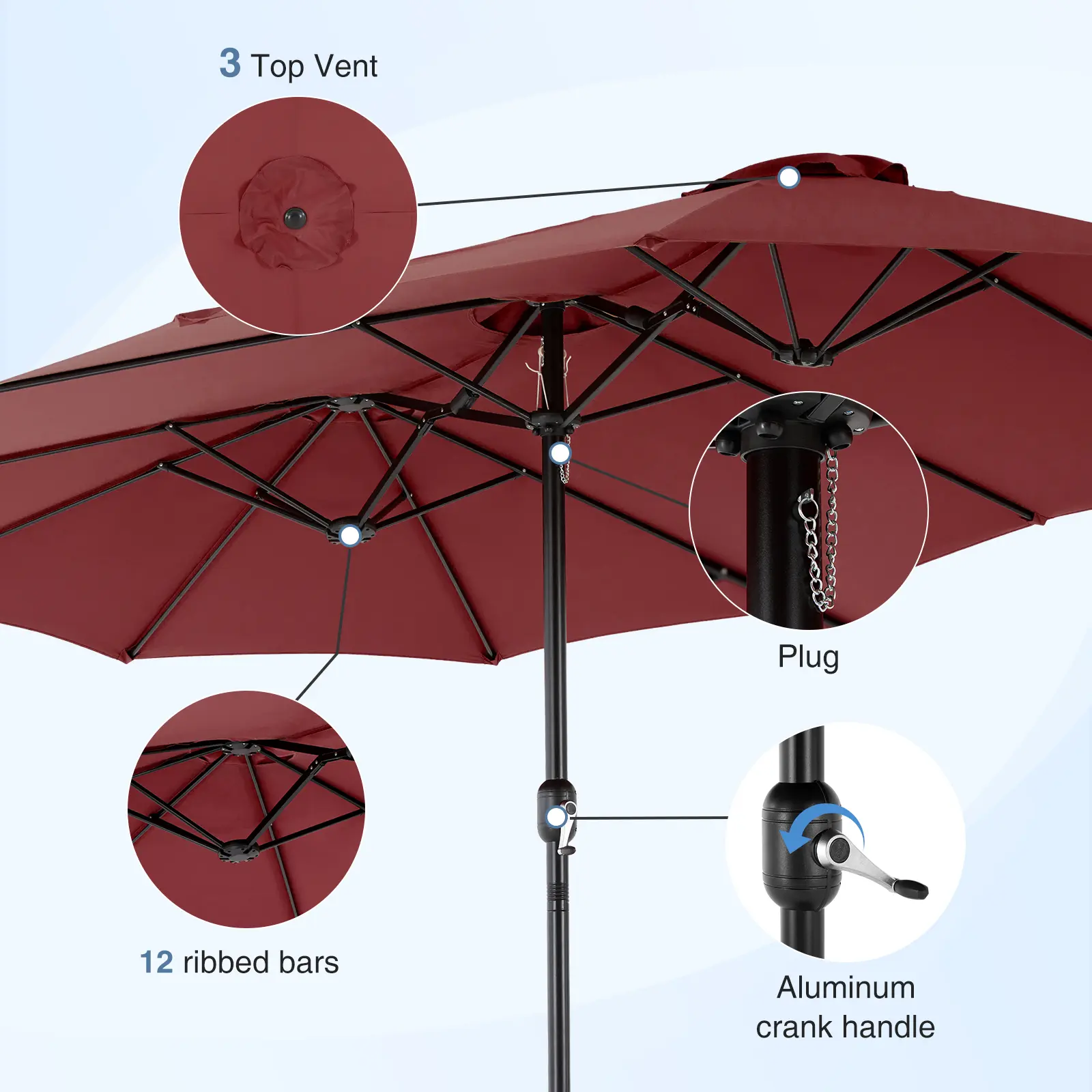 ·Friendly Design: 9 ft patio umbrella crank handle material is aluminum, with self-locking, and the top of the middle has a pin reinforcement (removed when closing the umbrella), the umbrella is more stable after opening not easy to close. Note: Due to the self-locking effect, it may be difficult to retract the umbrella in the first five circles.