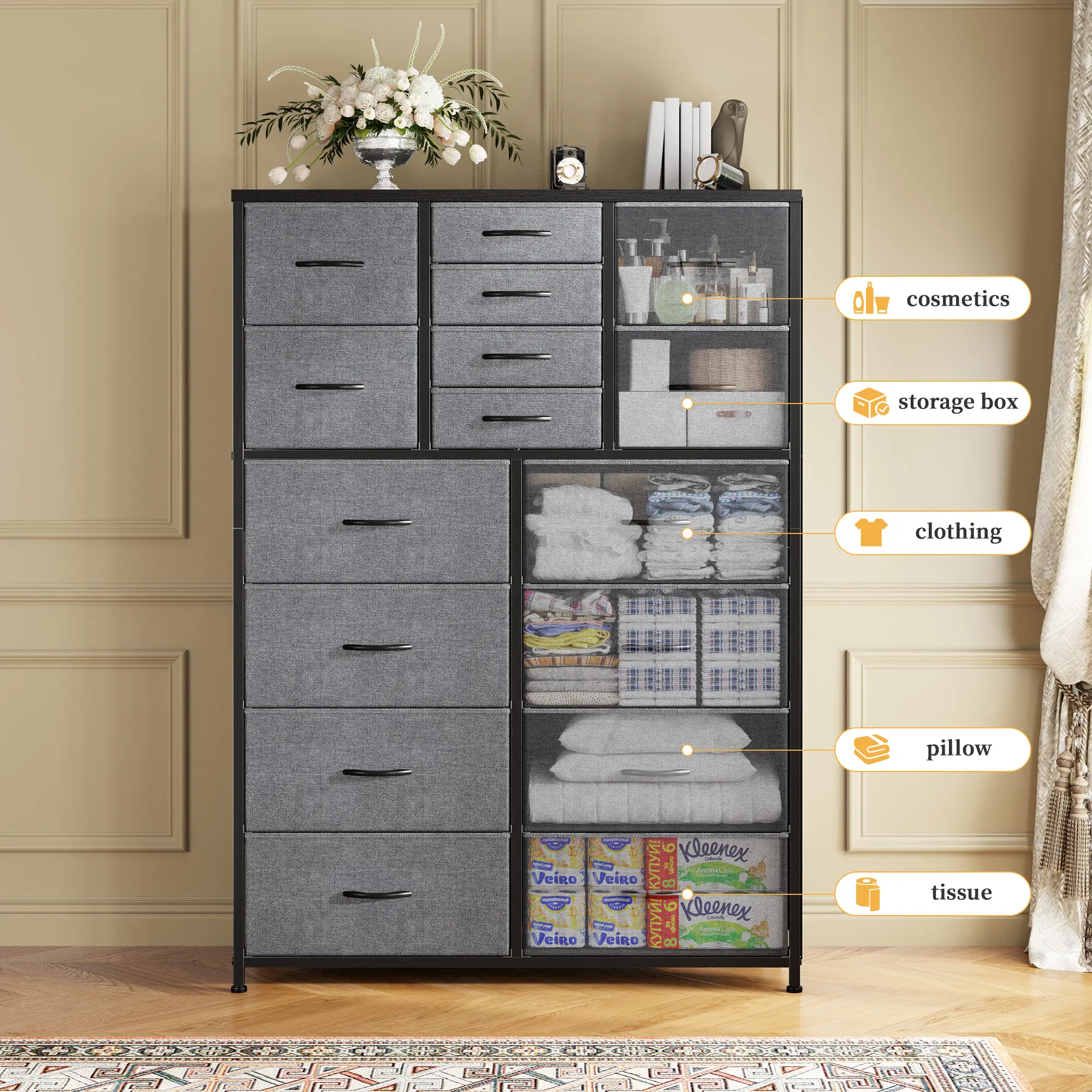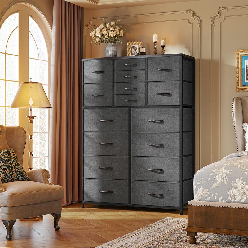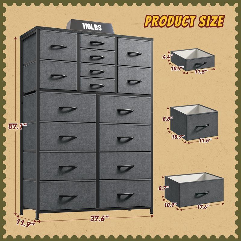 ·【16 FABRIC DRAWERS DRESSER FOR BEDROOM】 The size of this chest of drawers is 57.1 "X 37.4" W X 11.8 "D.