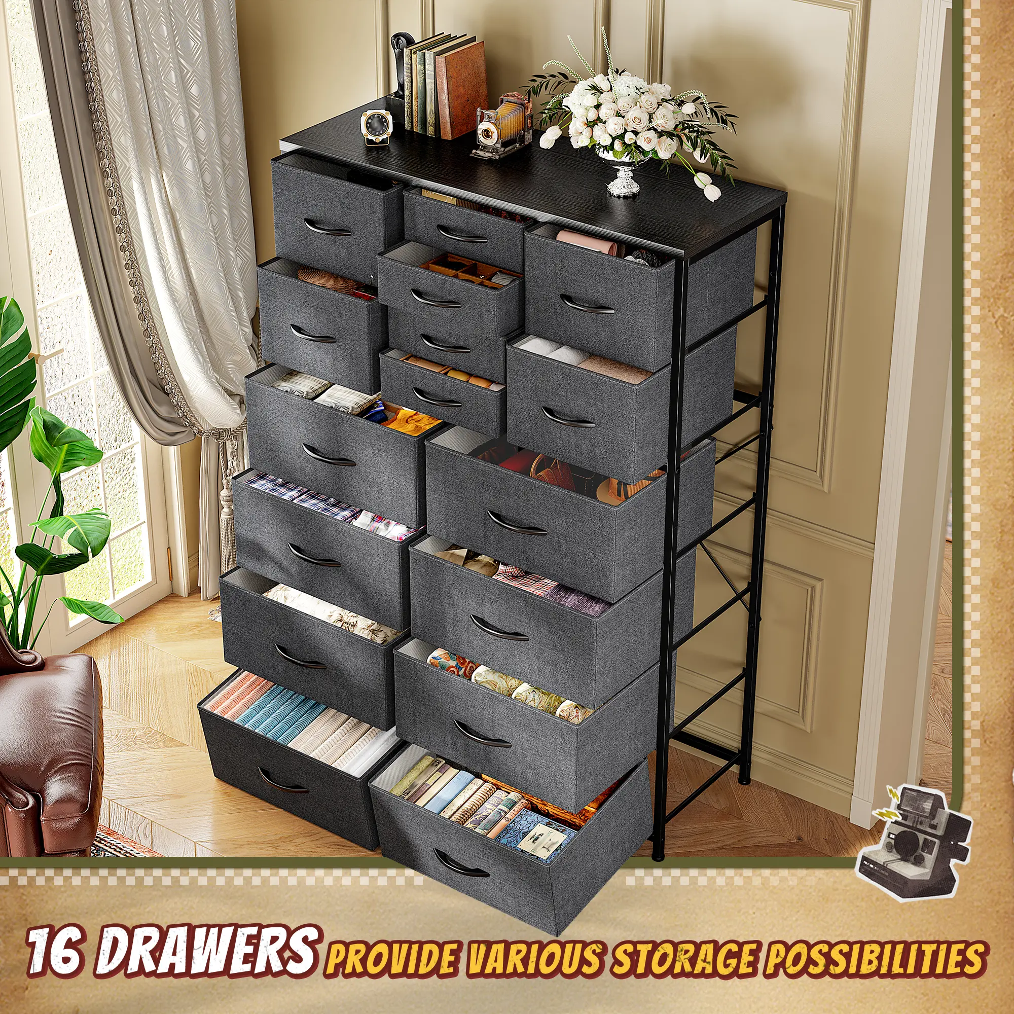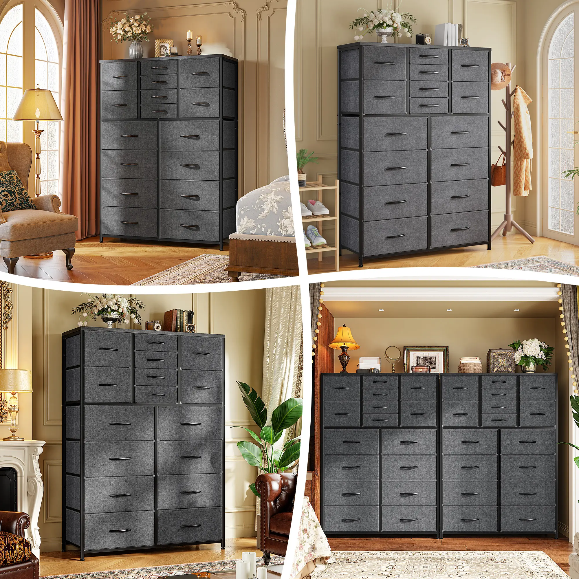 ·【"DOUBLE X" SUPPORT BAR DESIGN OF THE TALL DRESSER】 The structure of dressers & chests of drawers is made of advanced metal and wood boards, and the "double X" support bar is designed on the back to provide strong stability and bearing capacity for the large dresser, and each small drawer can accommodate at least 15-18 hats, medium drawer can accommodate at least 9-11 long sleeves, and large drawer can accommodate at least 16-20 shirts.