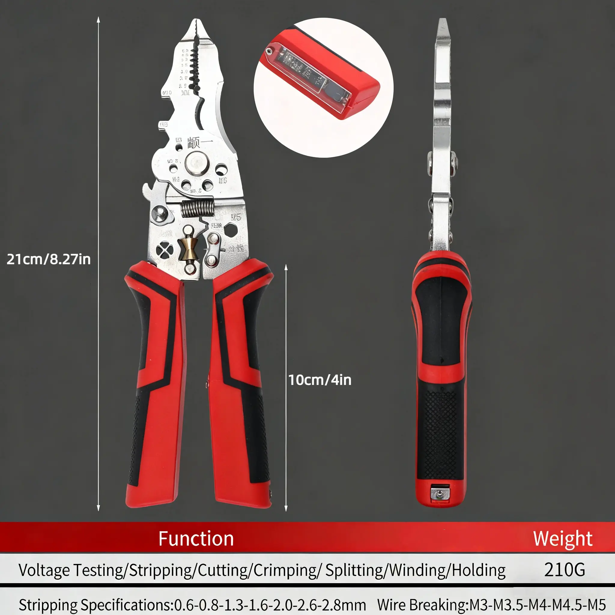 This wire stripper and twister features electricity measurement. It's perfect for efficient wire cutting, pulling, scraping, and pressing. Ideal for electricians and DIY enthusiasts. The tool combines multiple functions in one, making it a versatile choice for various tasks. ️