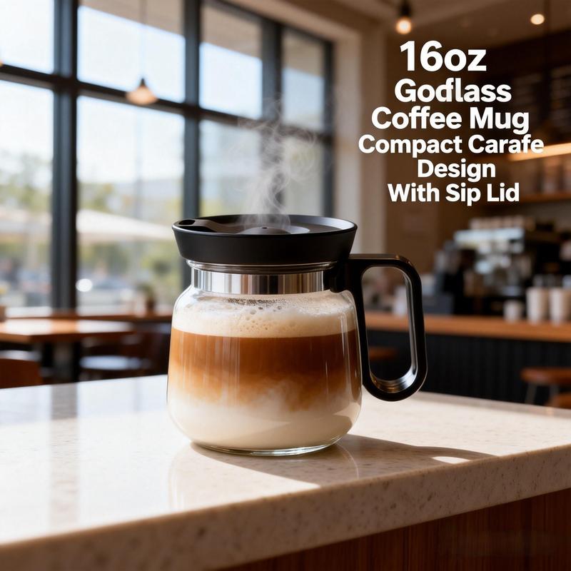 Crafted from durable, heat-resistant glass, it’s ideal for hot coffee, lattes, milk, tea, or iced beverages. The included sip lid helps reduce spills and keeps your drink cleaner—perfect for home, office, or content creation.