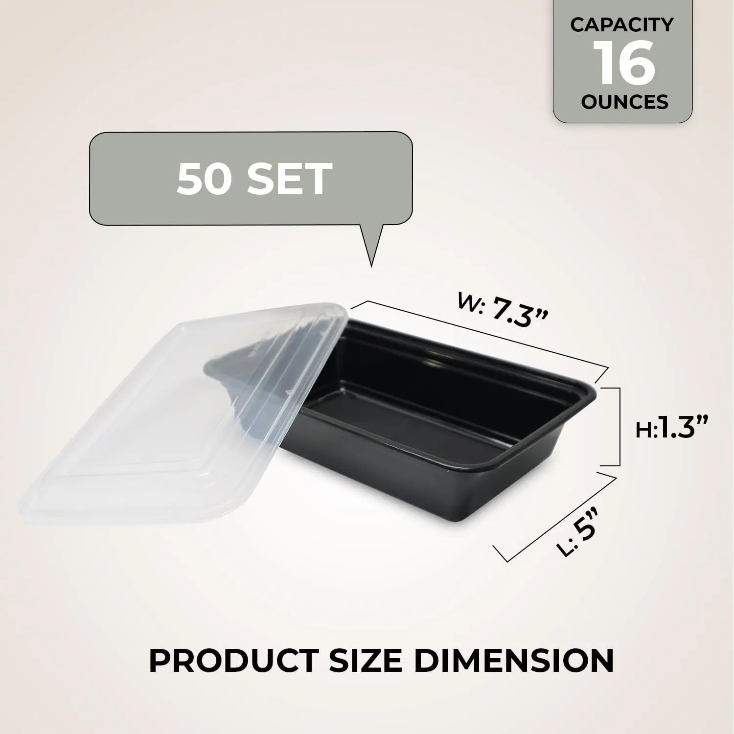 SIZE: Rectangular Shaped, 16 oz (580ml), 7.3" x 5.01" x 1.67" (185 x 127 x 42mm) / Includes 50 count of Black containers with Clear . in various sizes, for storing different quantities of , accommodating your needs from small snacks to large meals.