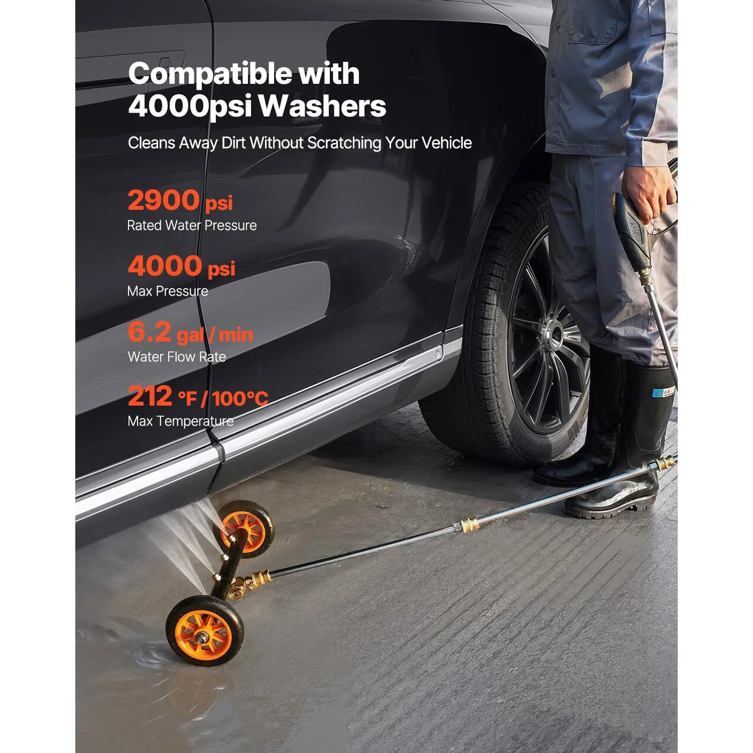 ·4000 PSI High Water Pressure: With a rated water pressure of 2900 PSI and a maximum pressure of 4000 PSI, this power washer surface cleaner can handle hot water up to 100°C, making it ideal for winter cleaning. It quickly removes dirt and debris without damaging your vehicle’s undercarriage.