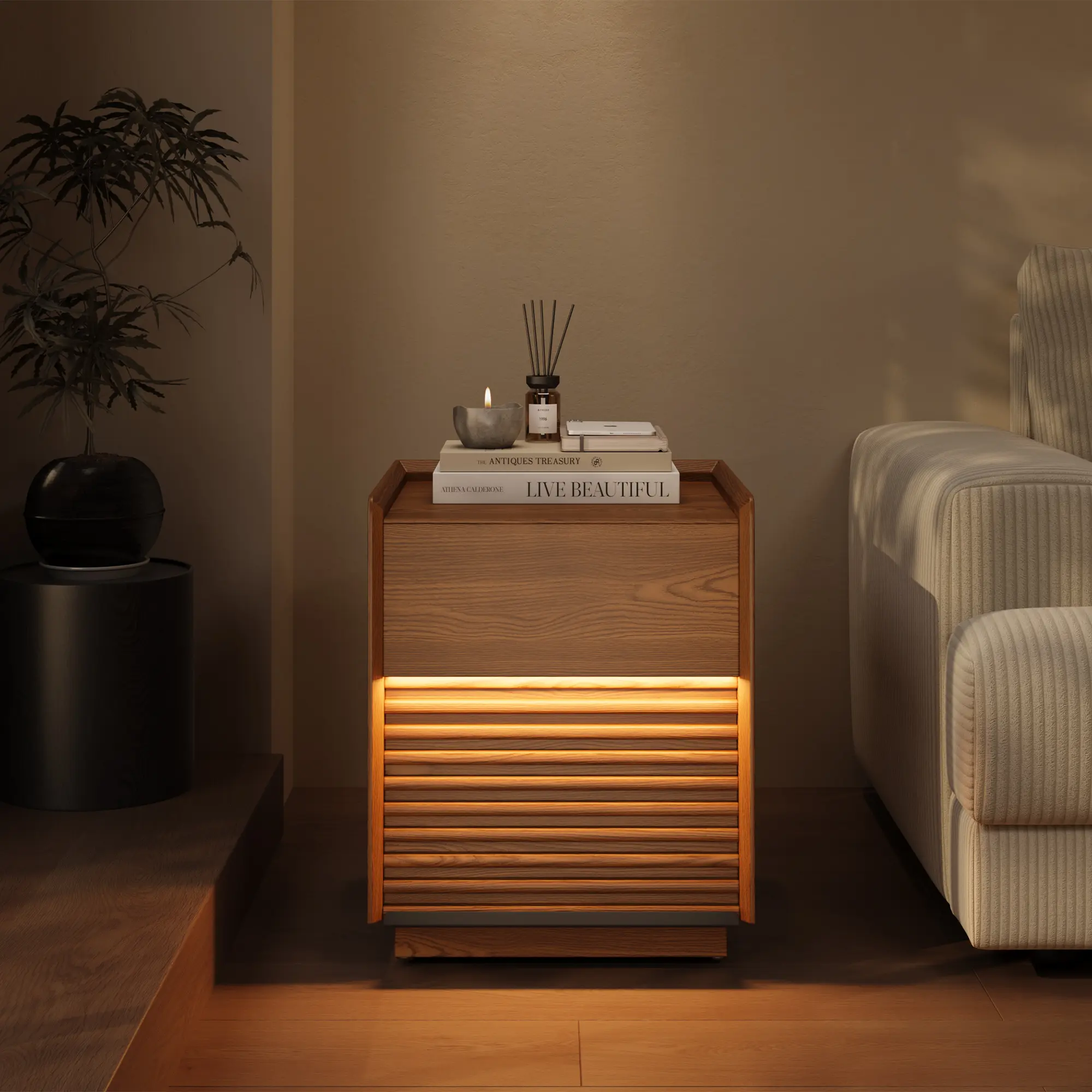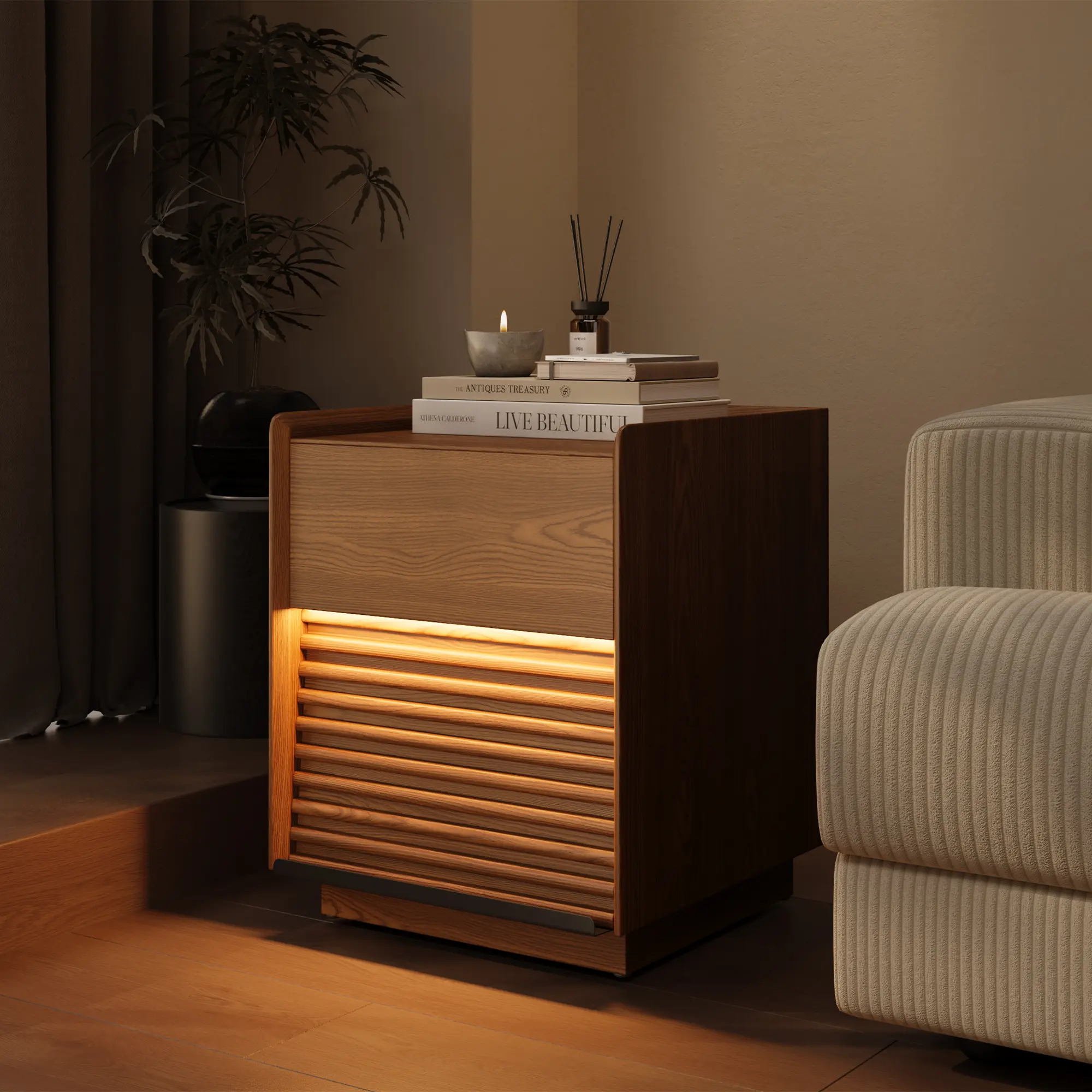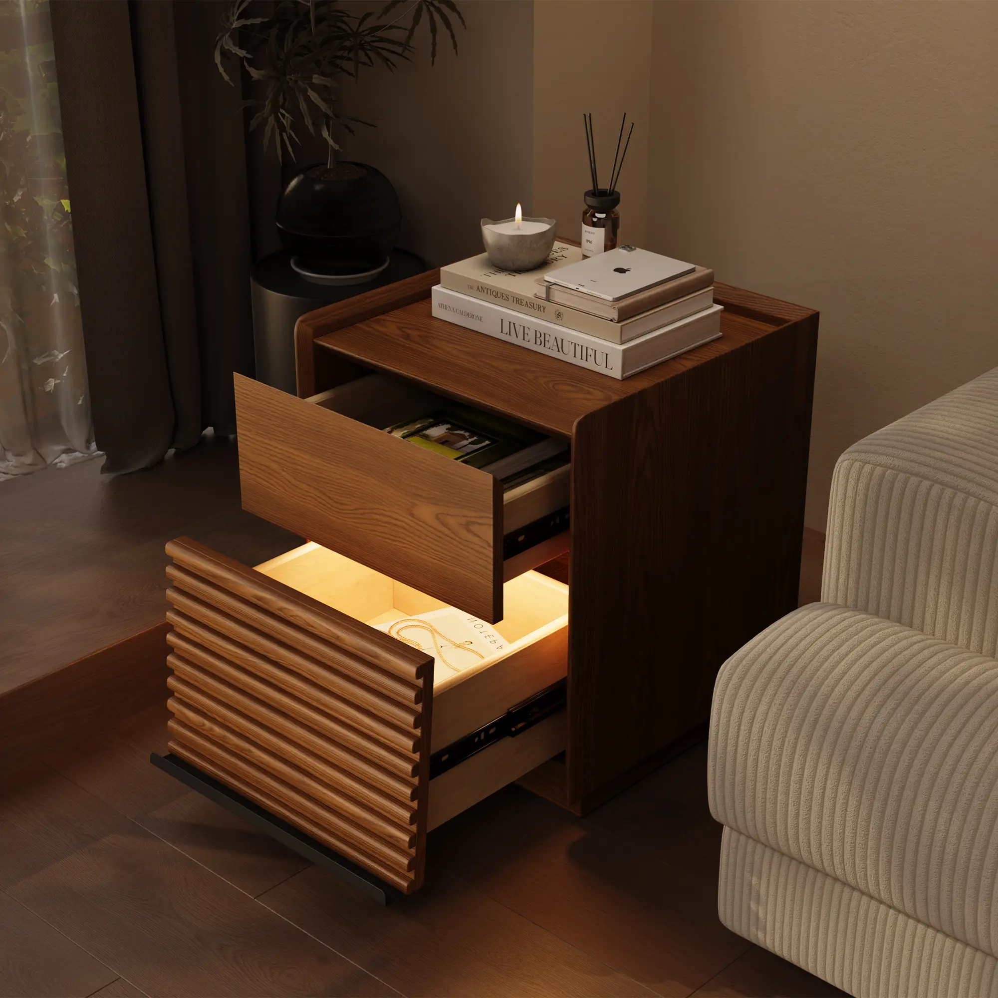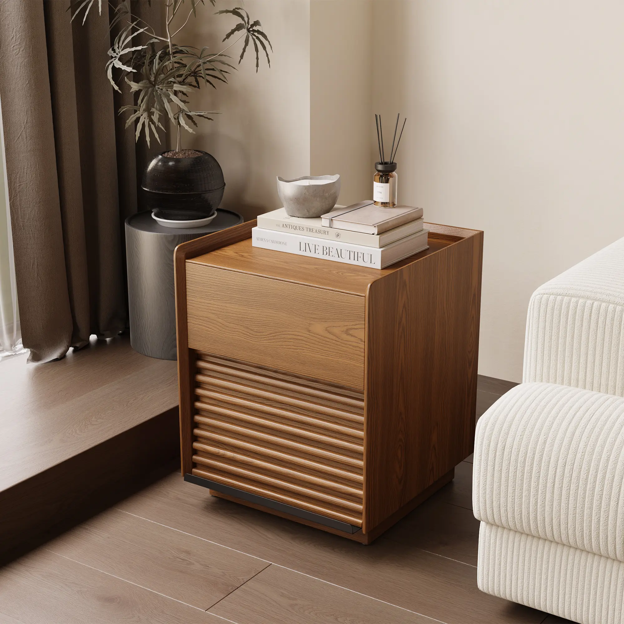 [Retro Walnut Color, Elegant and Steady]This side table features a walnut color as the main tone, with a unique small mountain grain veneer finish, which is retro yet fashionable, endowing the home space with a strong medieval charm. Whether placed in the living room, bedroom or study, it can add a touch of steady elegance to the space and bring a warm and high-quality living experience.[Exquisite Materials, Durable and Environmentally Friendly]The side table is made of high-quality multi-layer board combined with ash small mountain grain veneer finish, presenting a natural wood texture and quality, which is both beautiful and durable. The multi-layer board material has good compression resistance and stability, and the ash veneer not only enhances the overall texture but also shows the environmental protection and health of the material, providing users with a safe and reliable furniture option.[Clever Layered Design, Highly Practical]The side table adopts a clever layered design. The open storage area on the top is convenient for placing books, ornaments or frequently used items, while the closed storage area below can be used to store personal items, ensuring tidiness and privacy. The reasonable layout makes full use of the space and makes your daily life more convenient and orderly.[Delicate Handmade Craftsmanship, Demonstrating High-Quality Texture]The small mountain grain veneer finish of the panel has been finely polished, with a smooth and natural texture and a warm touch, showing high-level craftsmanship. Every detail of the side table is meticulously carved, pursuing excellent quality, so that you can feel its delicacy and texture every time you touch it.[Compact and Convenient, Suitable for Multiple Spaces]The product size is 40cm in length, 40cm in width and 50cm in height. It is small in size and suitable for various home scenarios. Whether it is beside the bed, by the sofa or at the desk, it can provide you with considerate storage services and perfectly blend with different space styles.