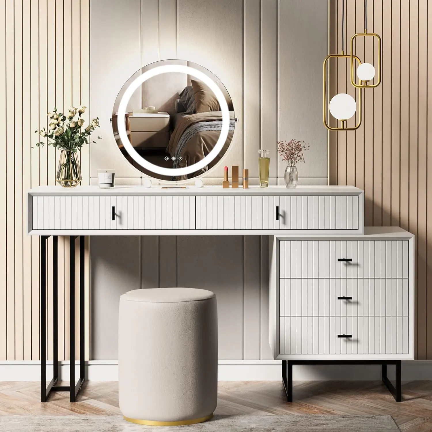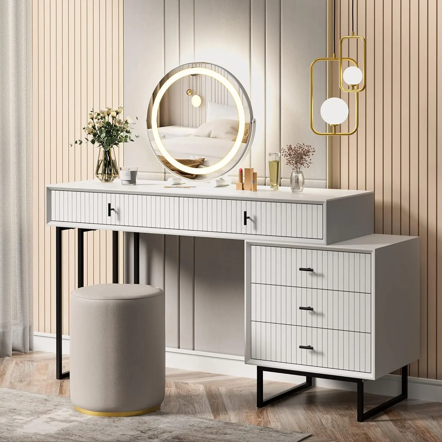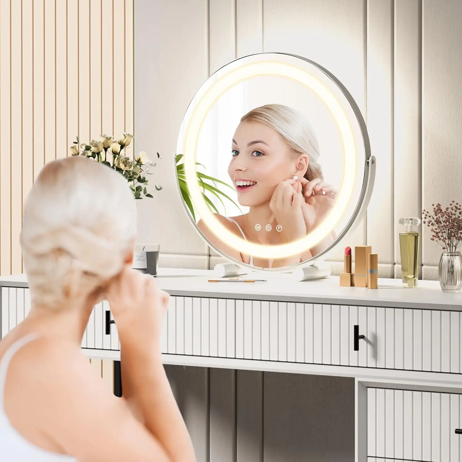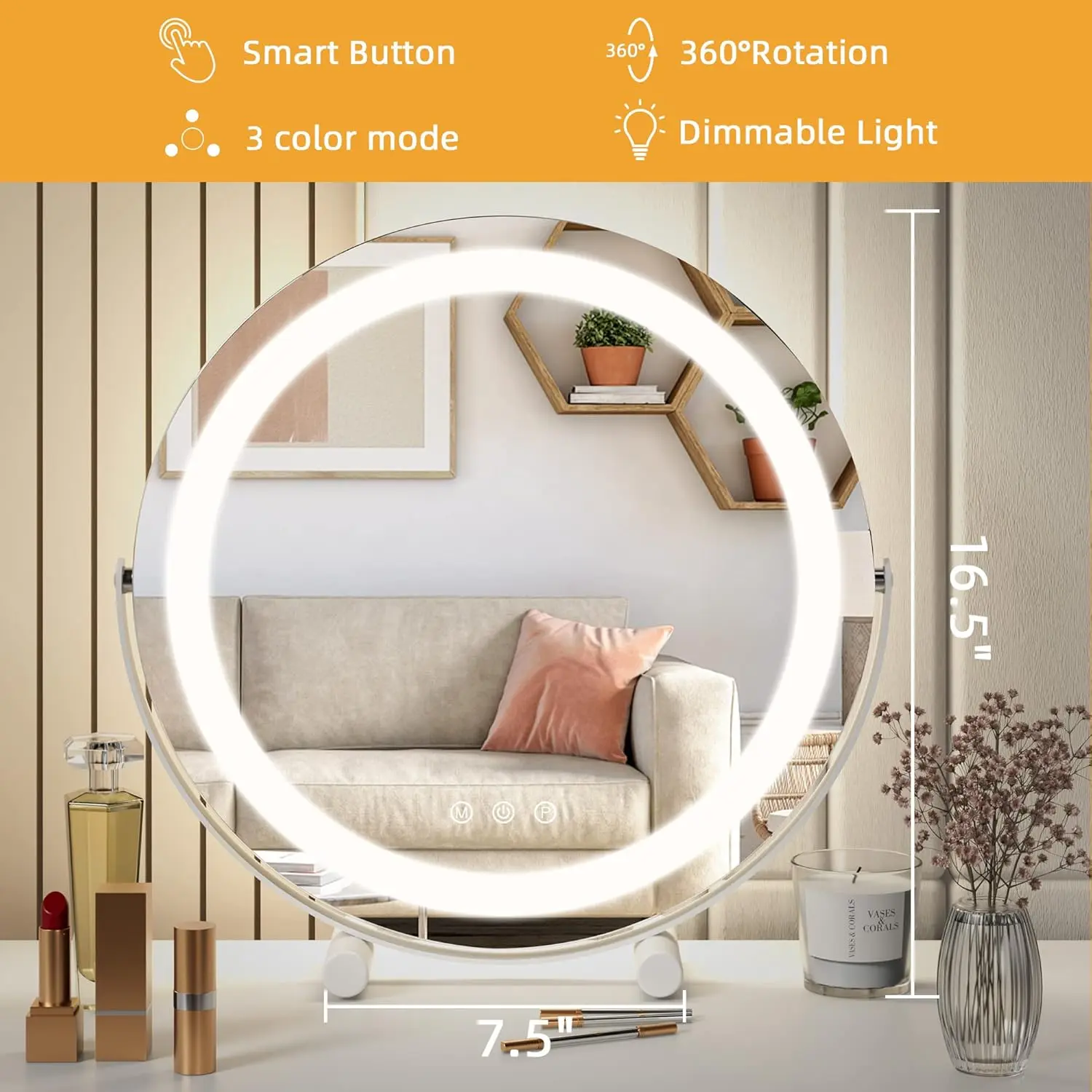 ·【COMFORTABLE MAKEUP EXPERIENCE】16”wide large round mirror ensures a more detailed and comprehensive view of your makeup. You can also observe your accessories and upper body wear through the mirror to achieve the perfect look with all the details.