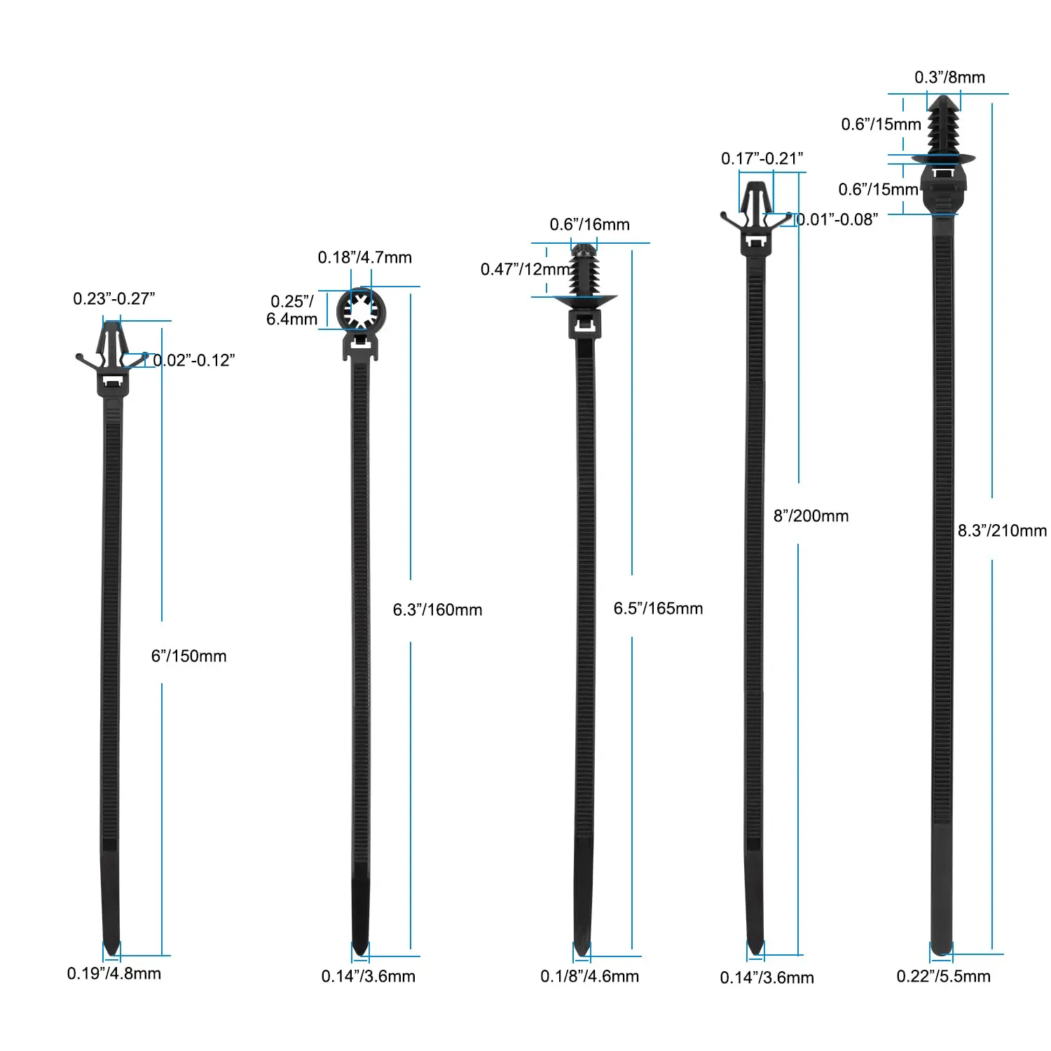 ·【Size and quantity】 (5.5* 210mm-0.21x8.3 inch) 40PCS thread head cable tie (4.6x170mm-0.18x6.7 inch) Cable ties with thread head 25PCS (4.8x150mm to 0.19x5.9inch) 15PCS of cable ties for the aircraft nose (3.6x200mm-0.14x7.9 in.) 15 aircraft headband (6.4 x 160mm to 0.25x6.3inch) M6 cable ties 15PCS