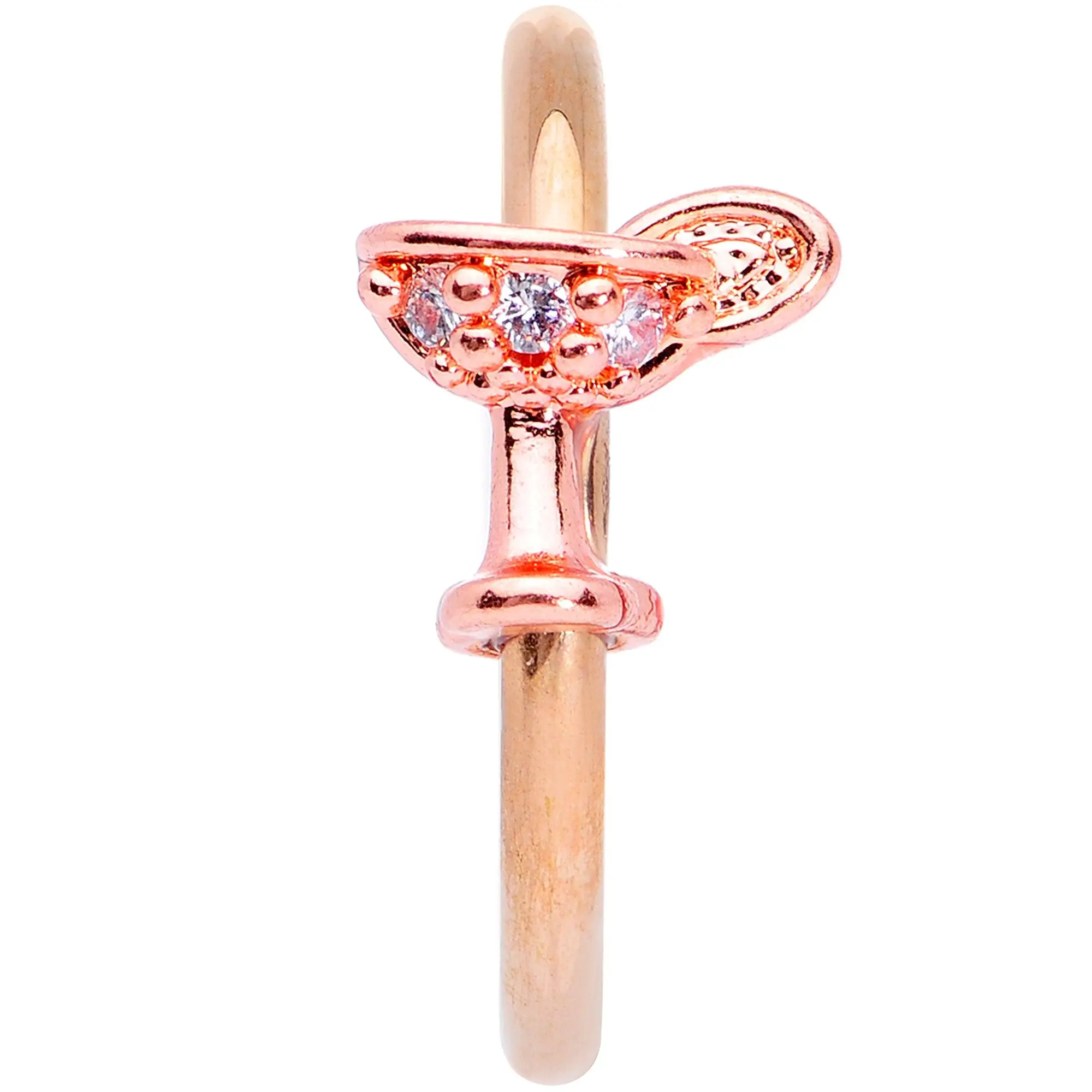 Get ready to make a holiday toast this New Year's Eve with the cocktail on this 16 gauge septum jewelry! Made with a 10mm rose gold tone PVD over 316L surgical grade stainless steel hinged circular ring, this cartilage jewelry features a festive front-facing cocktail charm set with clear gems complete with a cute lemon wedge detail. This Christmastime nose ring can be worn in a variety of piercings including your septum, eyebrow, and lip piercing as well as cartilage piercings like the helix, tragus, daith, rook, and more.Specifications16 Gauge (1.2mm), 3/8" (10mm), Rose Gold Tone PVD over 316L Surgical Grade Stainless Steel Hinged Circular Ring