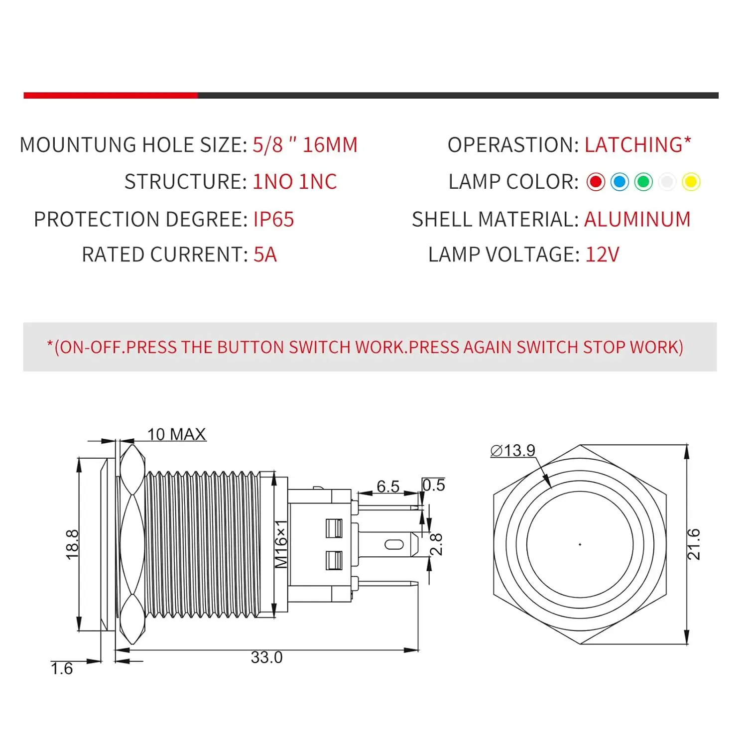 How to work:Press it to turn ON.Press it again to turn OFF.Contact configuration: 1NO1NC