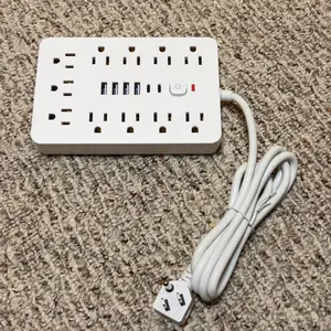 Multiple power strip with USB chargers. Can charge multiple electrical items at one time. Lays flat. Has a 3 prong power cord