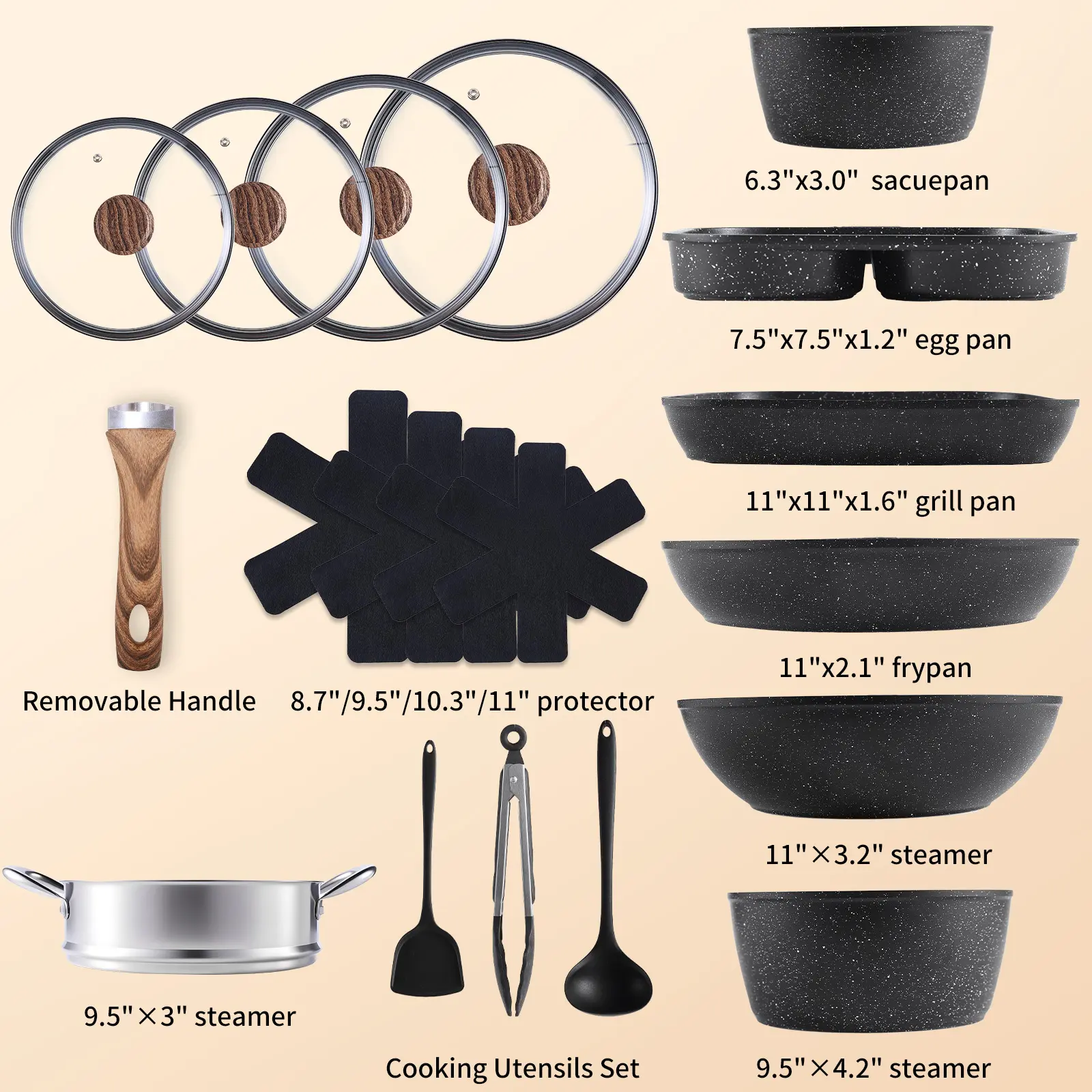 Complete 17-Piece Cookware Set- Includes: frying pot with glass lid, 9.5" soup pot with glass lid, 6.3" milk pot with glass lid, 11" frying pan, 11" square pan, 7.5" egg pan, 9.5" steamer, 4 pan protectors (8.7"/9.5"/10.3"/11"), 1 silicone ladle, 1 cooking tongs, and 1 silicone spatula.