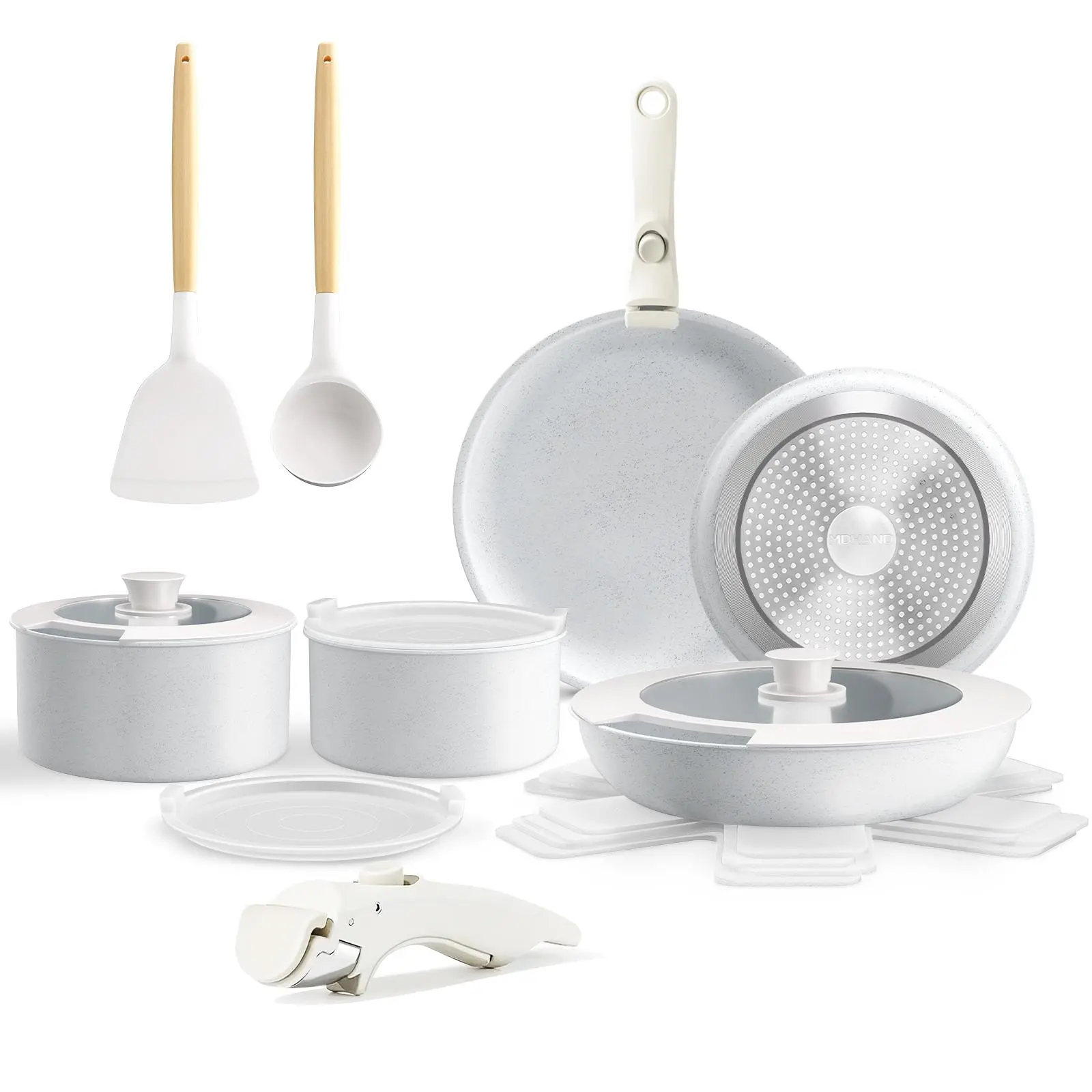17-piece set includes: 1.5-liter (16 cm) and 2.1-quart (7 cm) pots, 8-inch and 10-inch frying pans, 3.2-quart (25.4 cm) sauté pan, 2 removable handles, 7-inch and 10-inch glass lids, 6.3-inch and 1 3-inch freezer lids, 4 pot lids, silicone slotted spatula and spoon.