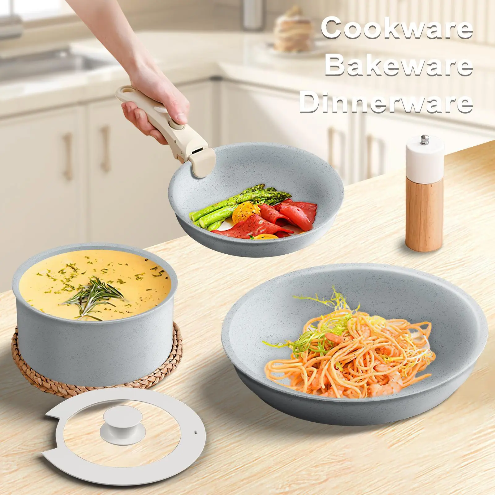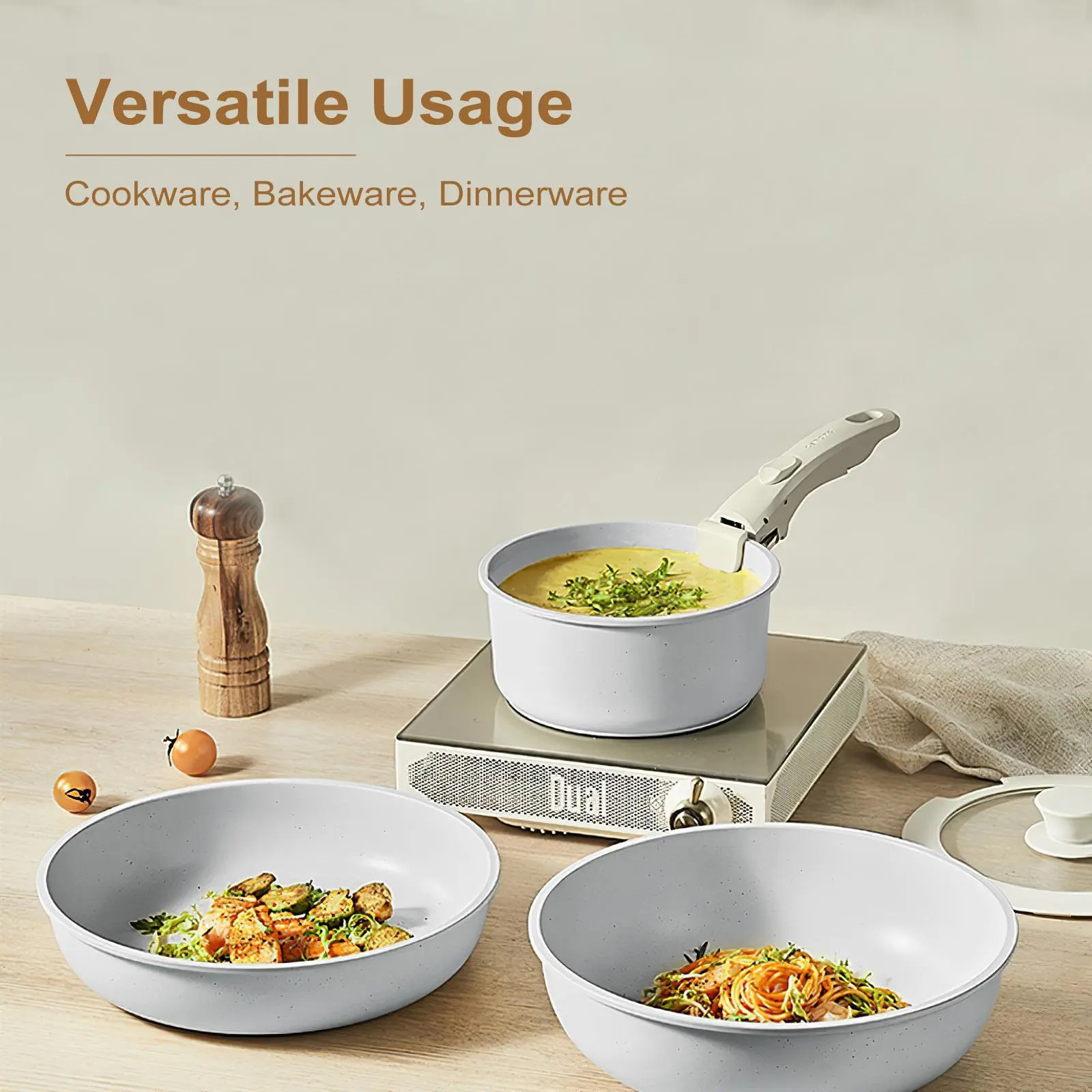 Removable Handles for Convenience: The non-stick cooking pot set features removable handles, and the ceramic cookware can be converted into baking trays and bowls for easy storage and cleaning. This unique design saves space in the kitchen cabinets and is dishwasher-safe for worry-free maintenance.