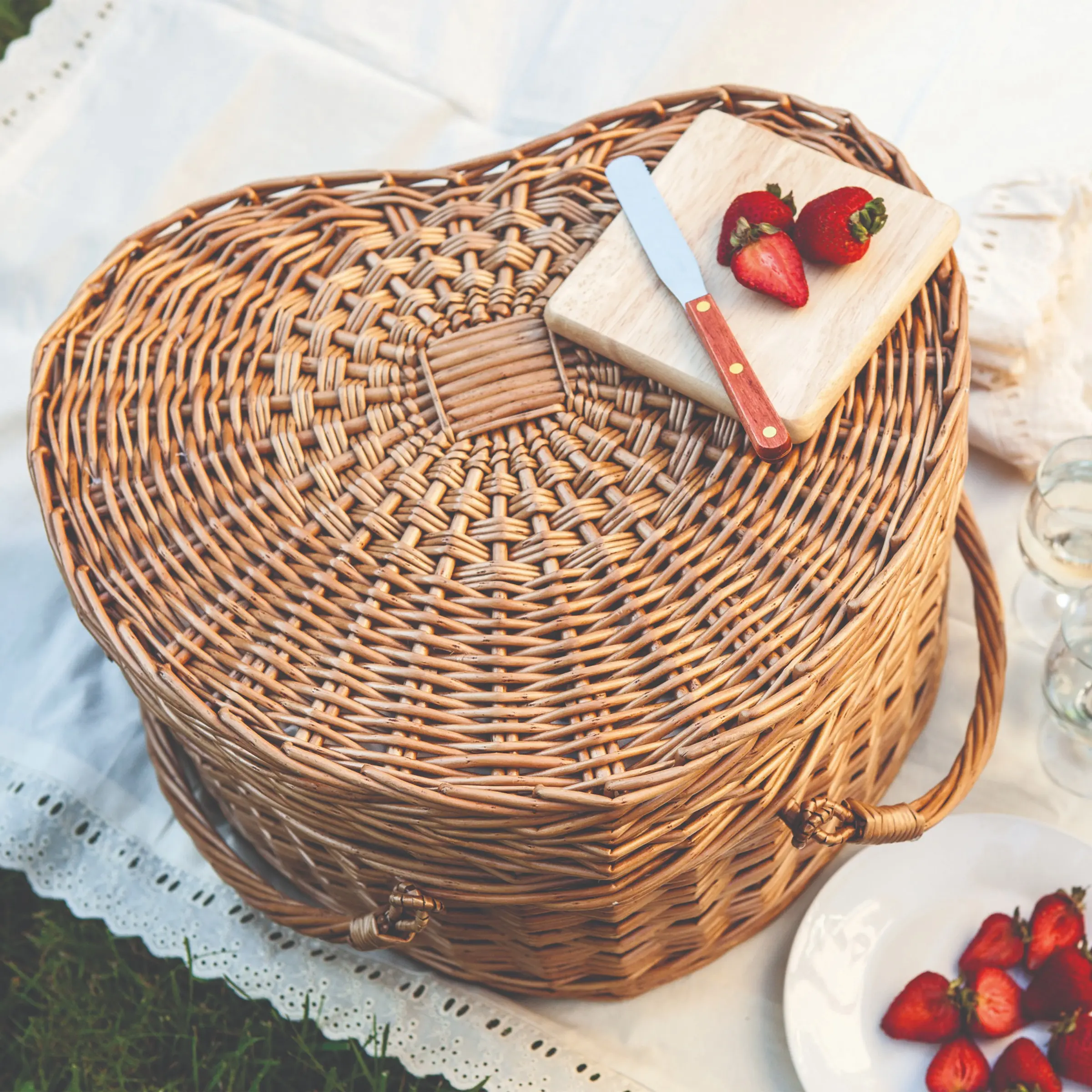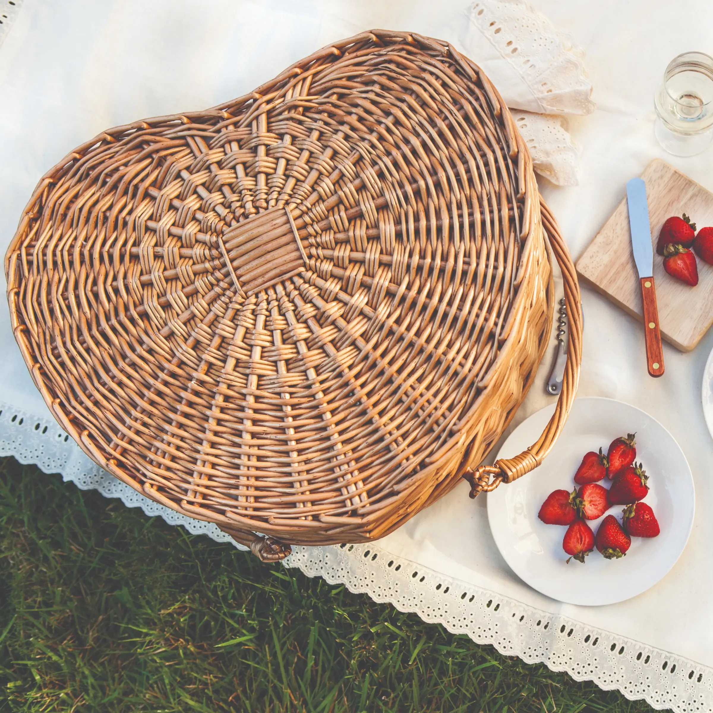 Lovebirds swoon over the heart-shaped, handwoven-willow Heart Picnic Basket, a picnic set designed for deluxe picnic, wine, and cheese service for two. The plush fully-lined interior, napkins, and tablecloth come in lovely antique white, and the porcelain plates, hand-blown wine glasses, silverware, hardwood cutting board, stainless steel waiter-style corkscrew, and salt & pepper shakers are secured by dark brown leatherette straps. This complete picnic basket is perfect for Valentine's Day, your anniversary, or any intimate rendezvous under the sun and stars. Not to mention if you're looking for the absolutely perfect wedding gift!