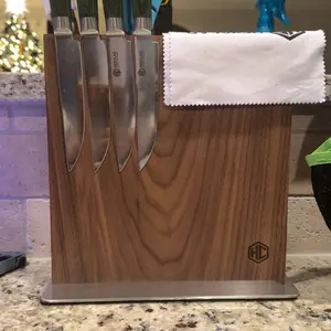 My wife and myself are really enjoying this knife block and how holds and displays our Hexclad knives. Both sides can be utilized so you can have your Hexclad kitchen knives on one side and the Hexclad steak knives on the other. Another plus is the small countertop footprint it has, and it will also support the honing rod as well. Keep up the good work Hexclad.