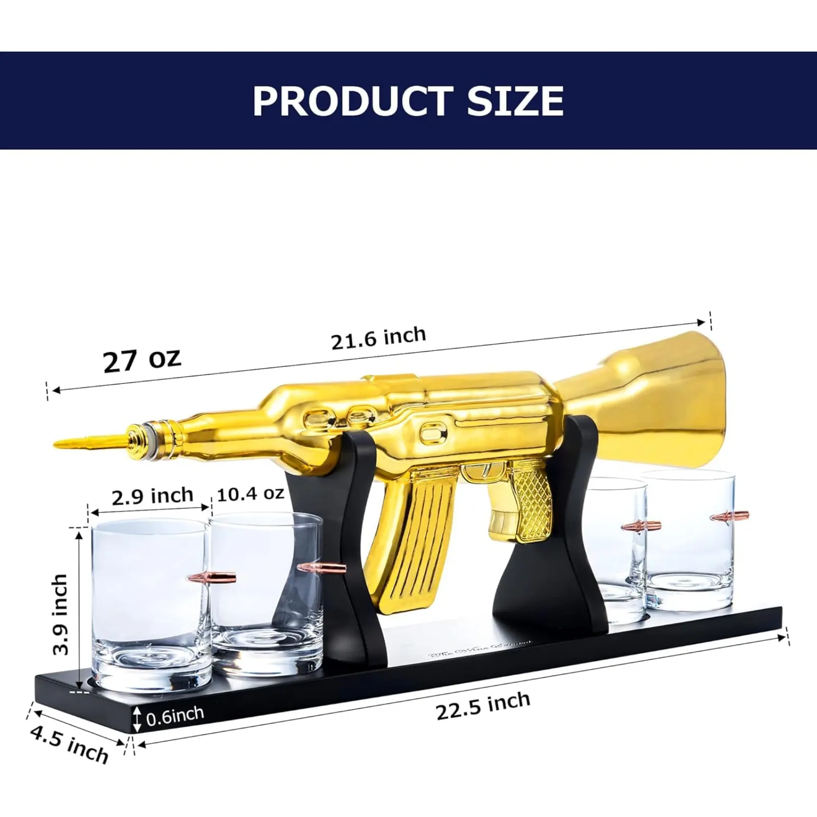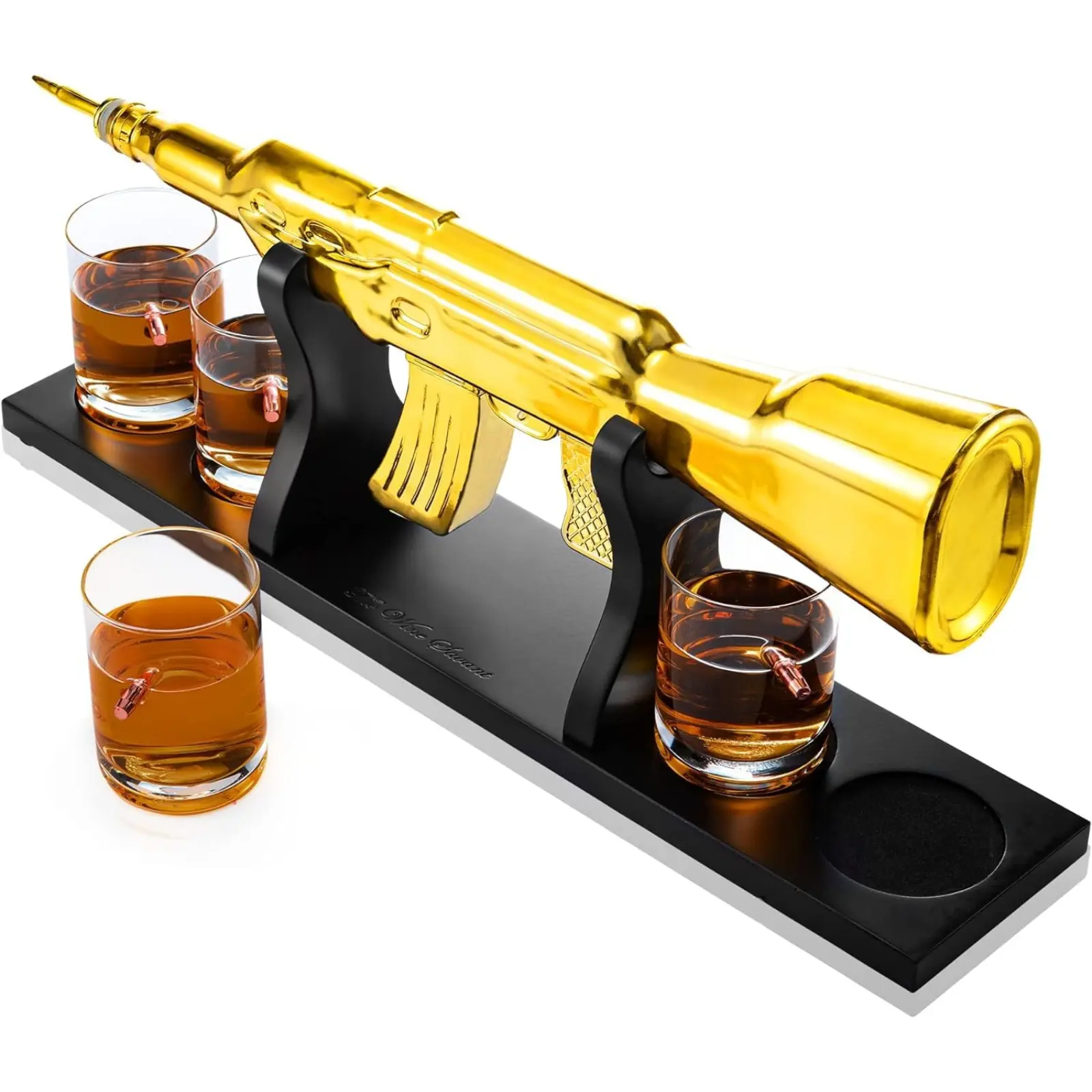 ·PROFESSIONAL QUALITY AND CLASSIC LOOK: The Gold AK is delicately crafted and carved to produce the most realistic-looking gun decanter on the market. The addition of the gold color will make this whiskey decanter a focal point in your home bar. The decanter holds up to 27 oz and the four bullet whiskey glasses hold 10.5 ounces of your favorite liquor.