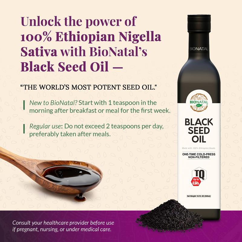 Experience the purity of authentic Ethiopian black seed oil. BioNatal Ethiopian Black Seed Oil is 100% pure, cold-pressed, unrefined, and unfiltered Nigella sativa seed oil, sourced from certified farms in Ethiopia and produced in small batches for freshness, consistency, and quality.