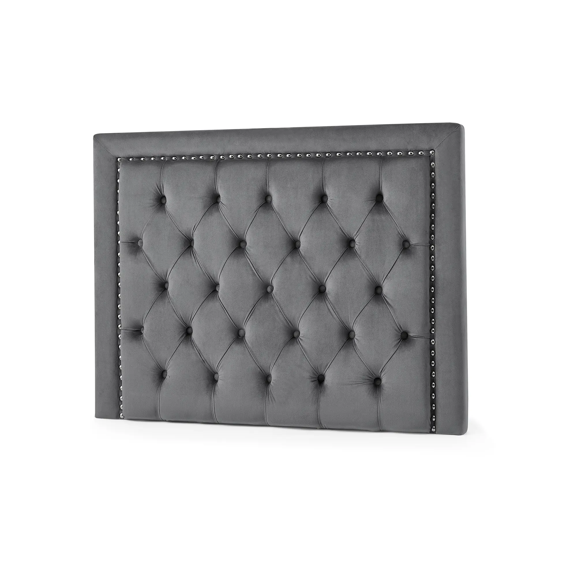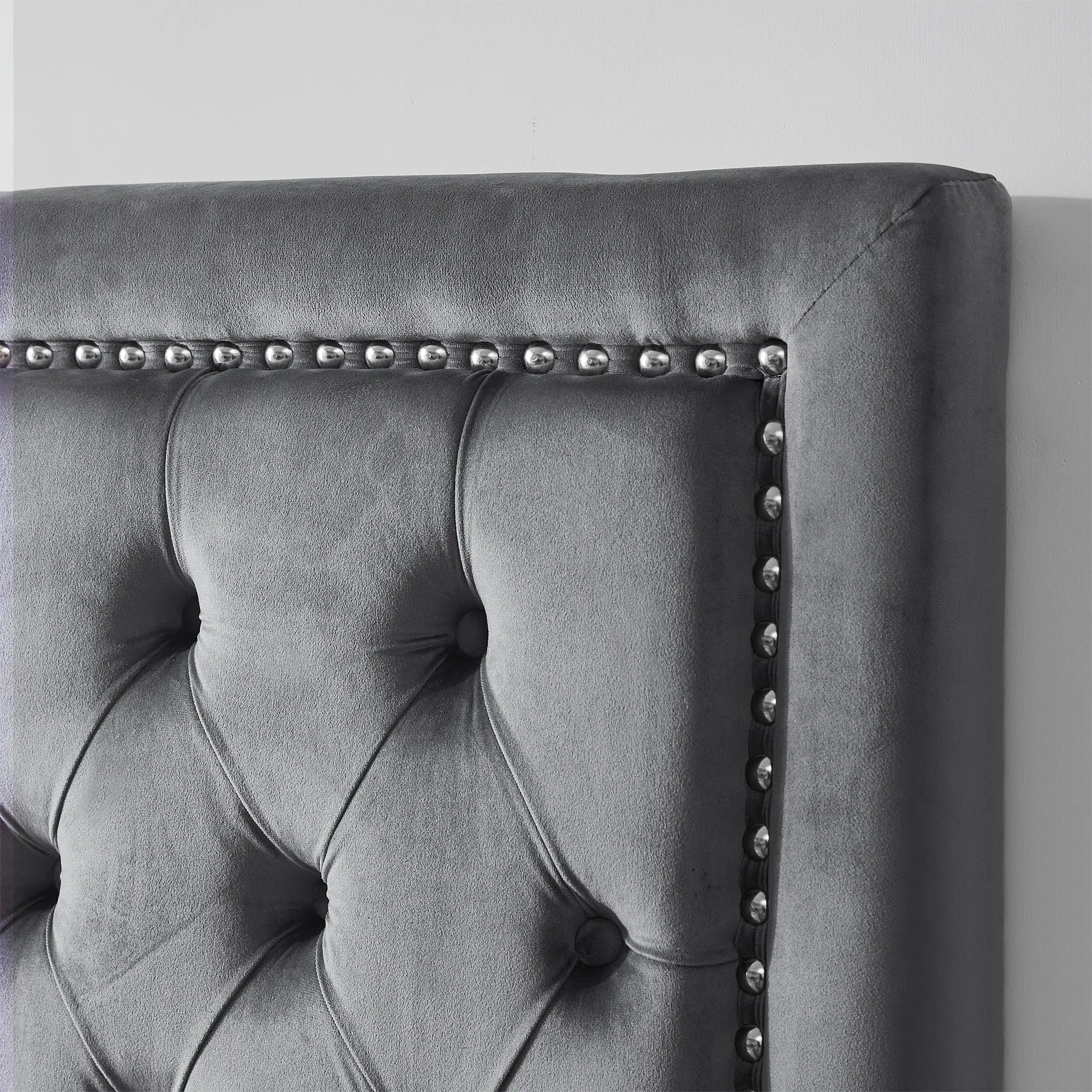 ·Upgrade your TXL bed with a gray tufted headboard bordered by nailhead trim