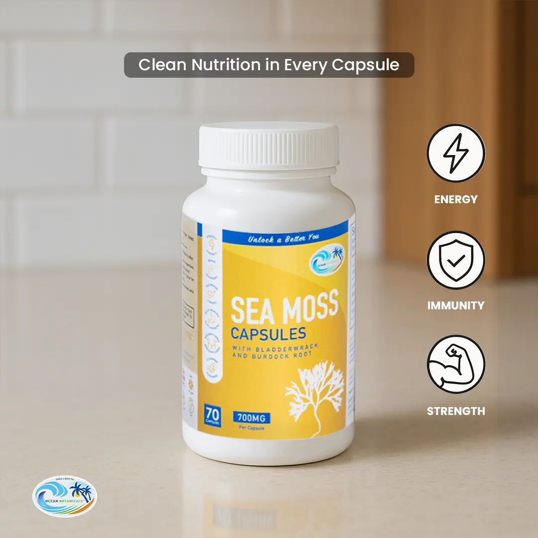 Our 3-in-1 formula combines the nutrient-dense benefits of Wildcrafted Sea Moss, the metabolism-boosting properties of Bladderwrack, and the antioxidant power of Burdock Root — all in one convenient, easy-to-swallow capsule.