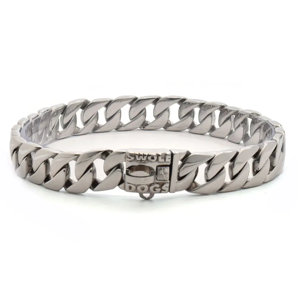 The Rolls Royce of dog collars has arrived!! 24mm of sexy sleek silver!! Big baller cuban link chain; highest quality thick and perfect for those who really want to floss. Chain measurements are from end of chain to clasp. Sold by competitors for $299.99, we are bringing you the quality you desire at a a much more affordable price. Please measure your dogs neck correctly and add 1 to 3 inches so it hangs where you want to hang. Important Note:This collar is recommended for decorative use. Item is not recommended to be used as an everyday collar. We highly recommend the item be used for shows, events, etc. only.