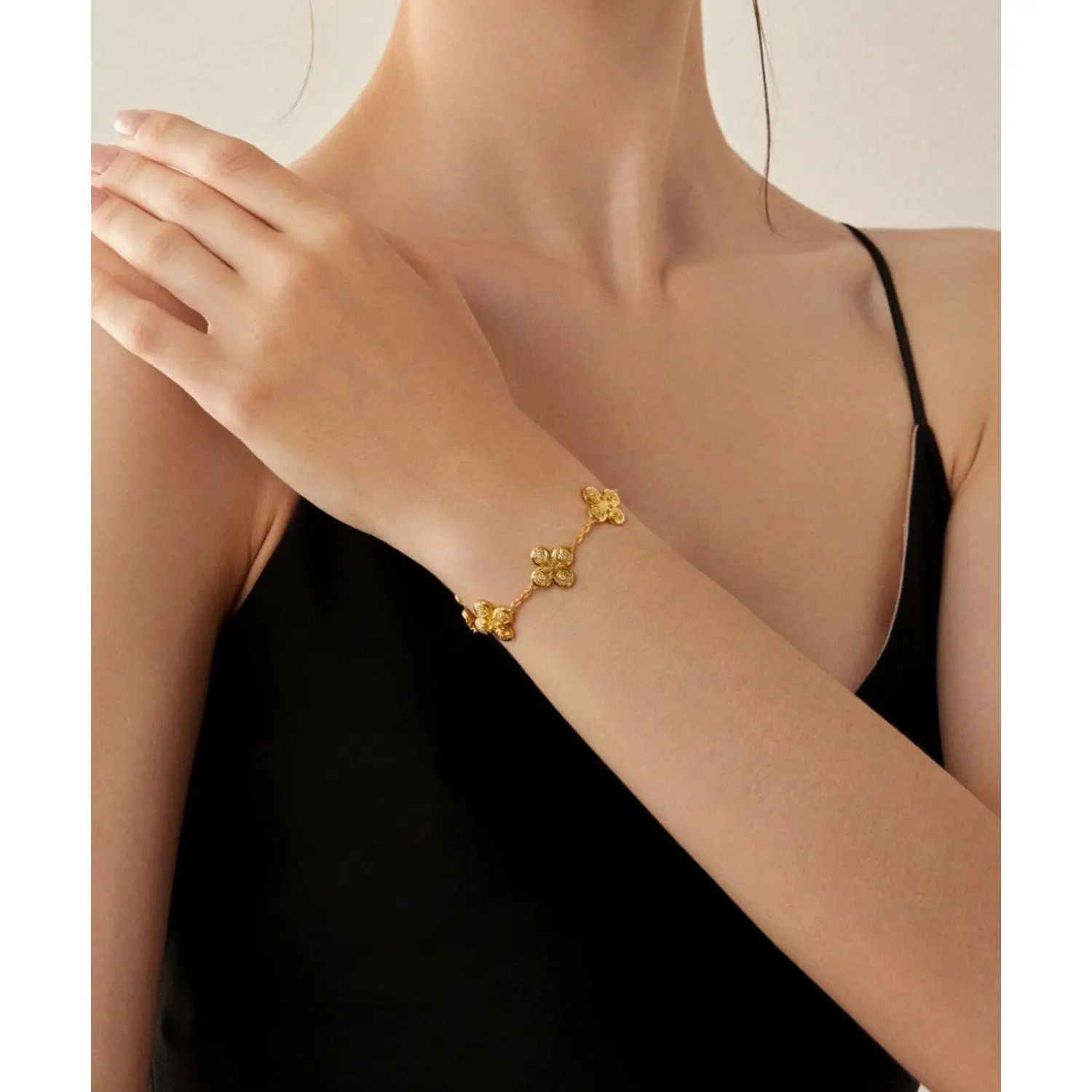Each bracelet is meticulously crafted with a solid layer of 24K gold over a 925 sterling silver base, ensuring durability and everlasting radiance. The delicate clover design adds a touch of charm and grace to your ensemble, making it a versatile and stylish accessory for any occasion.