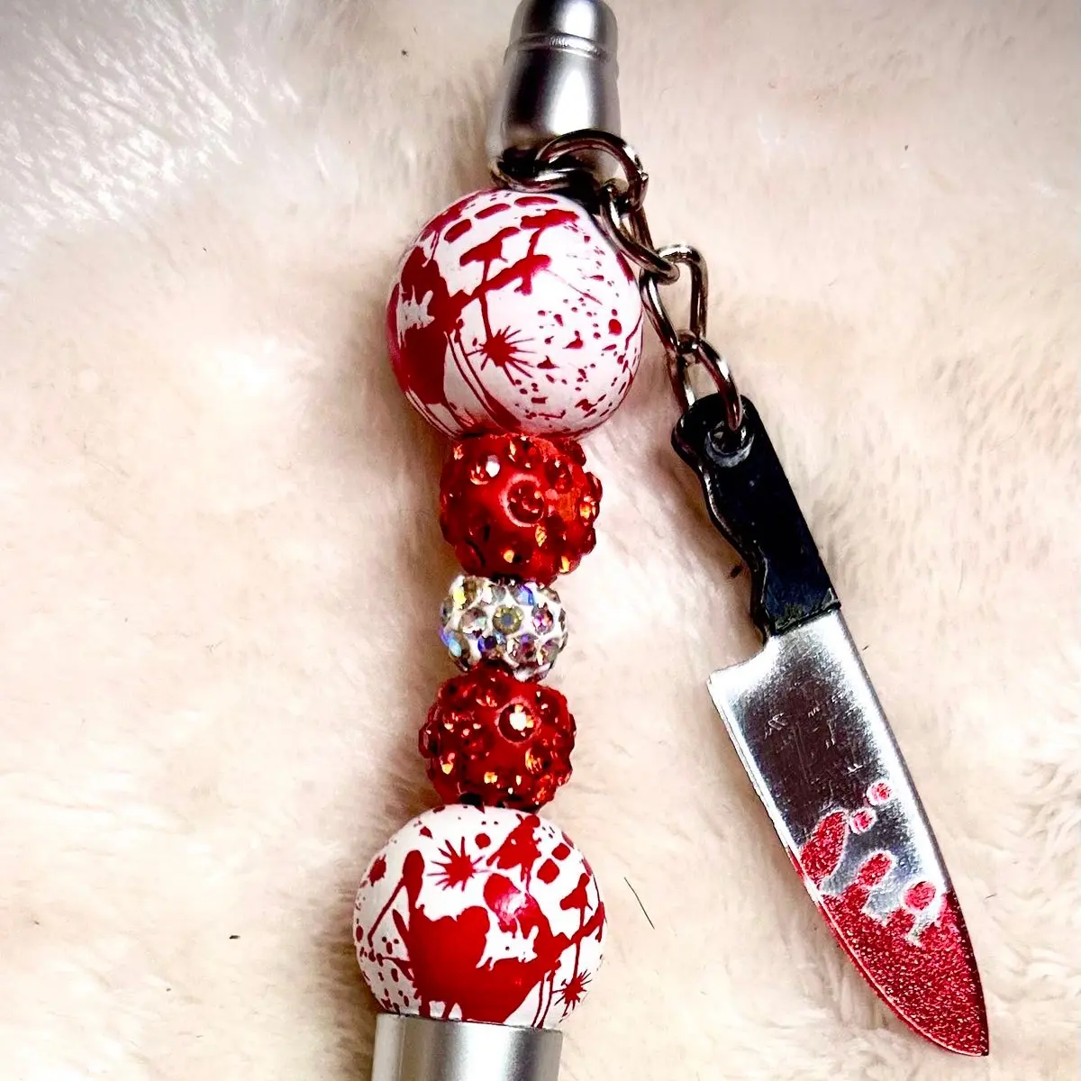Custom beaded pen with rhinestone and blood splattered bubblegum beads with bloody kitchen knife charm comes with ink refills.