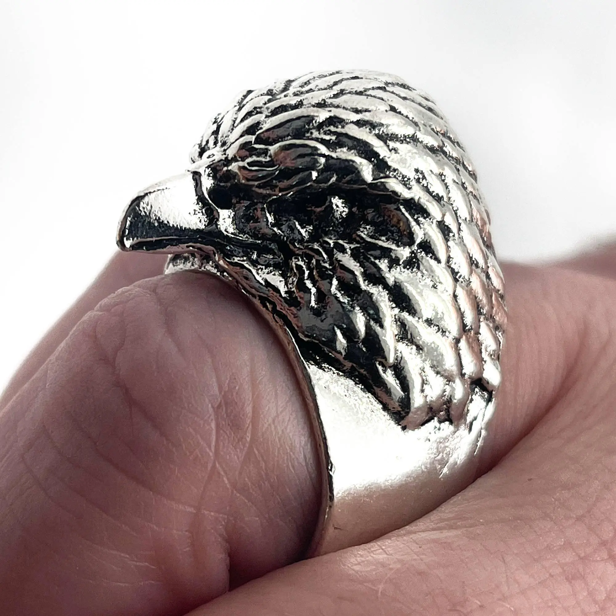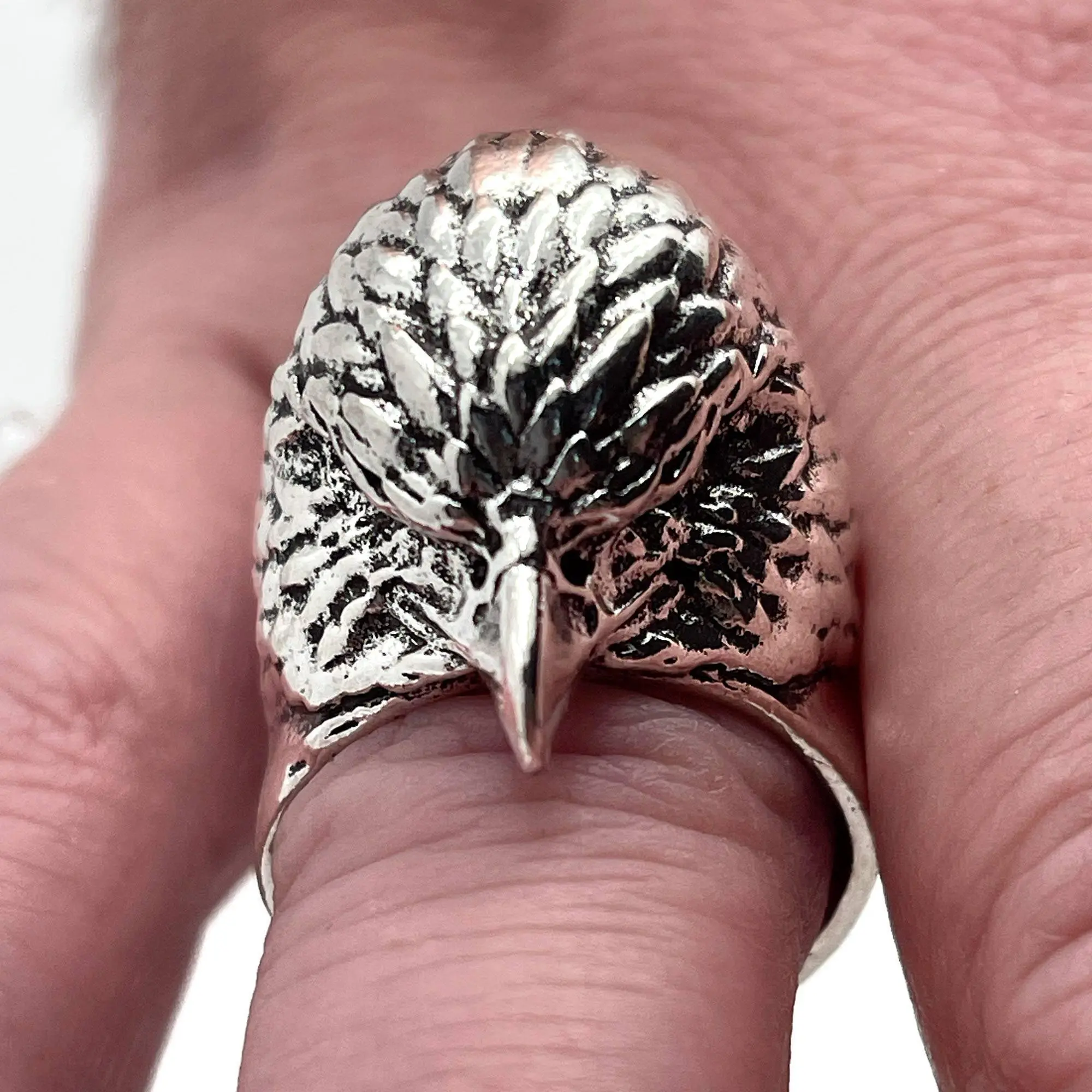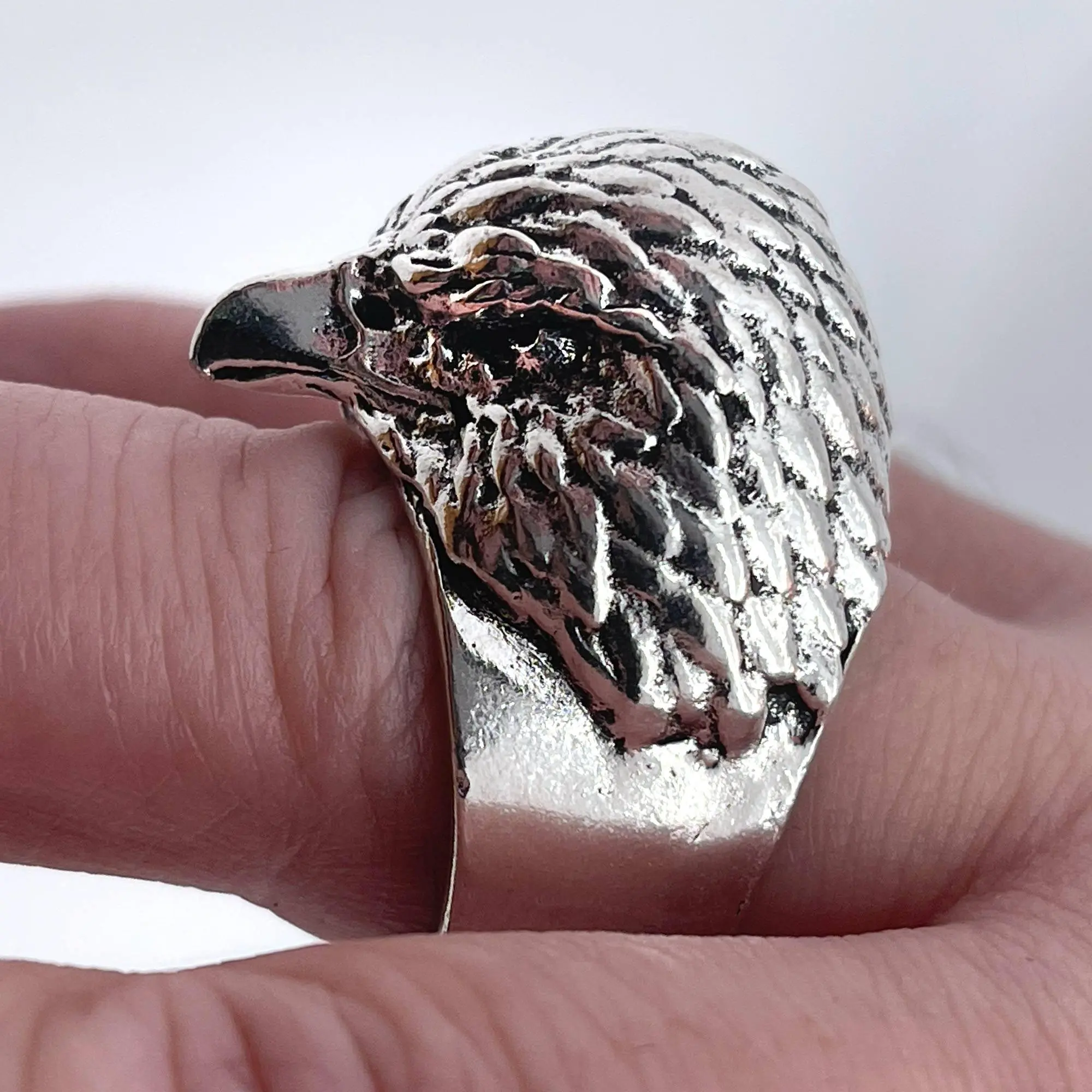 One of the most majestic birds with one of the most ill-fitting squawks now exists as a ring that could easily cause some damage. We picture this ring with a smoking jacket and a cane. Channel your inner superspy villain as you calmly place one hand on top of the other and look down the forehead of the eagle towards your opponent. The eagle stares down for you now. Relish the small bit of majesty residing on your finger.