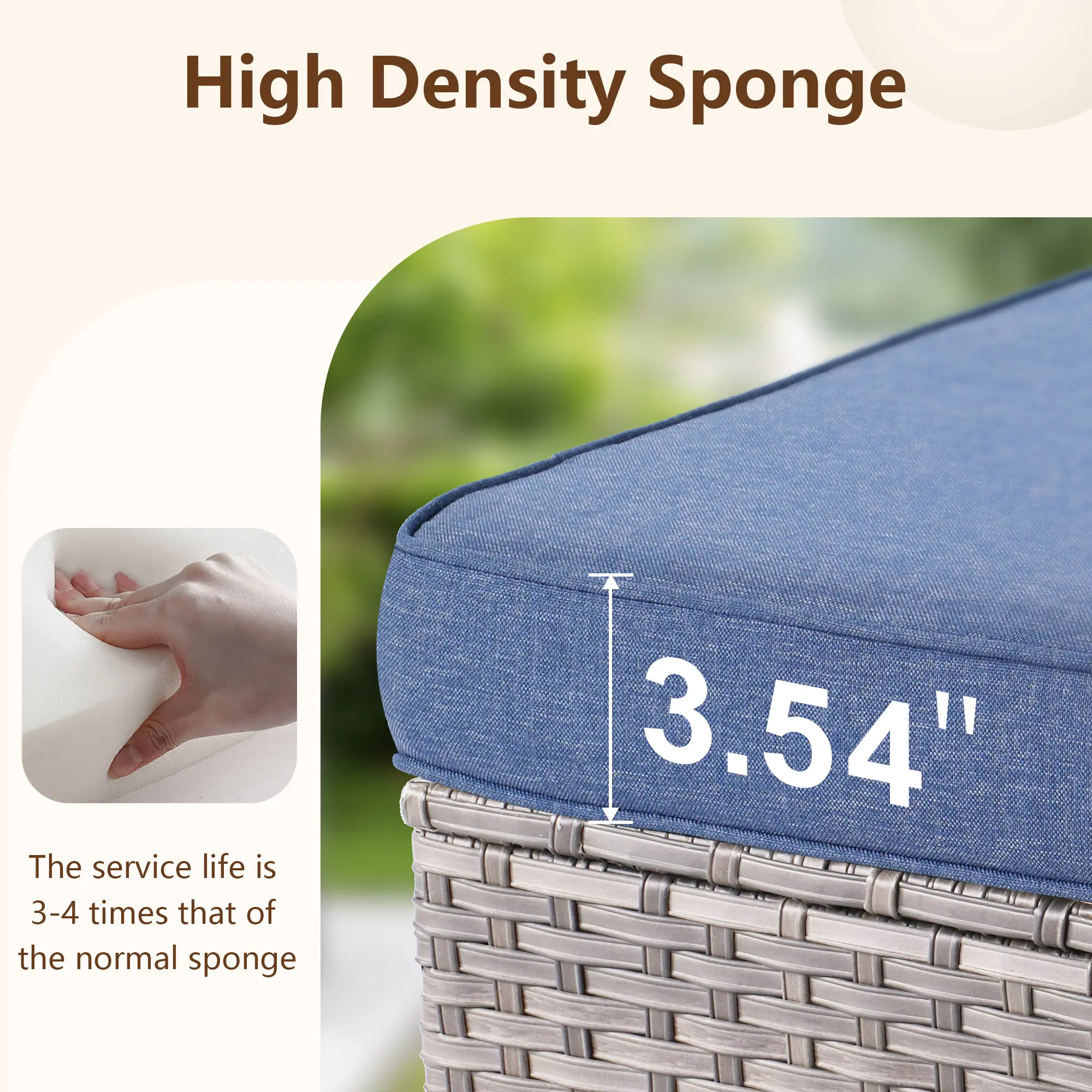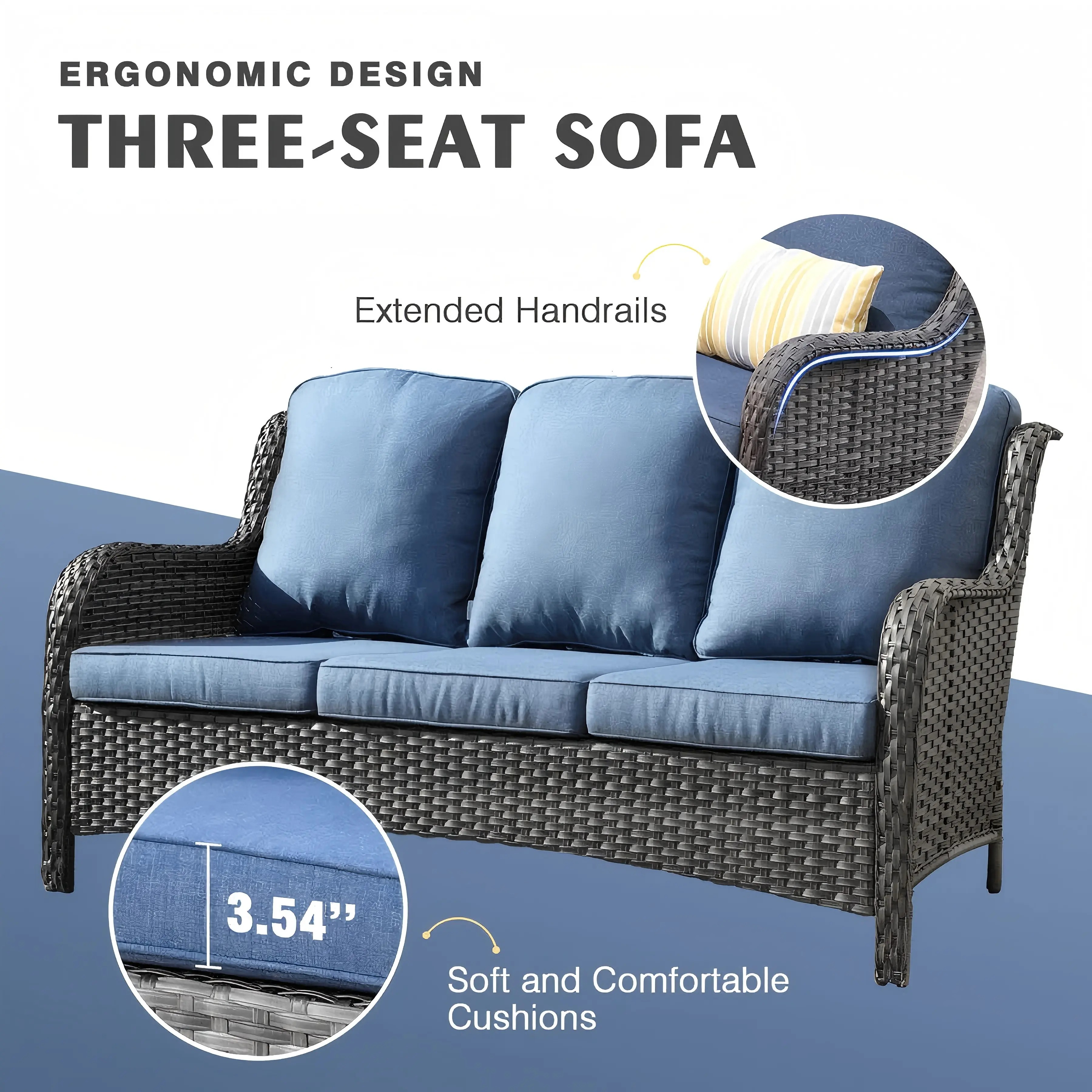 Seating Capacity 5 Weight capacity Chair 250 LBS, Couch 660 LBS Seating Inner Frame Material Steel Frame Seating Outer Frame Material PE Wicker Wicker Durability Water Resistant; UV Resistant Cushions Included Yes Number of Cushions Included 12 Cushion Durability Water Resistant; UV Resistant Cushion Thickness 3.54" Cushion Attachment Type No Direct Attachment Method Removable Cushion Cover Yes Cushion Cover Closure Method Zipper Cushion Fill Material Foam/Cotton Cushion Cover Material Fabric