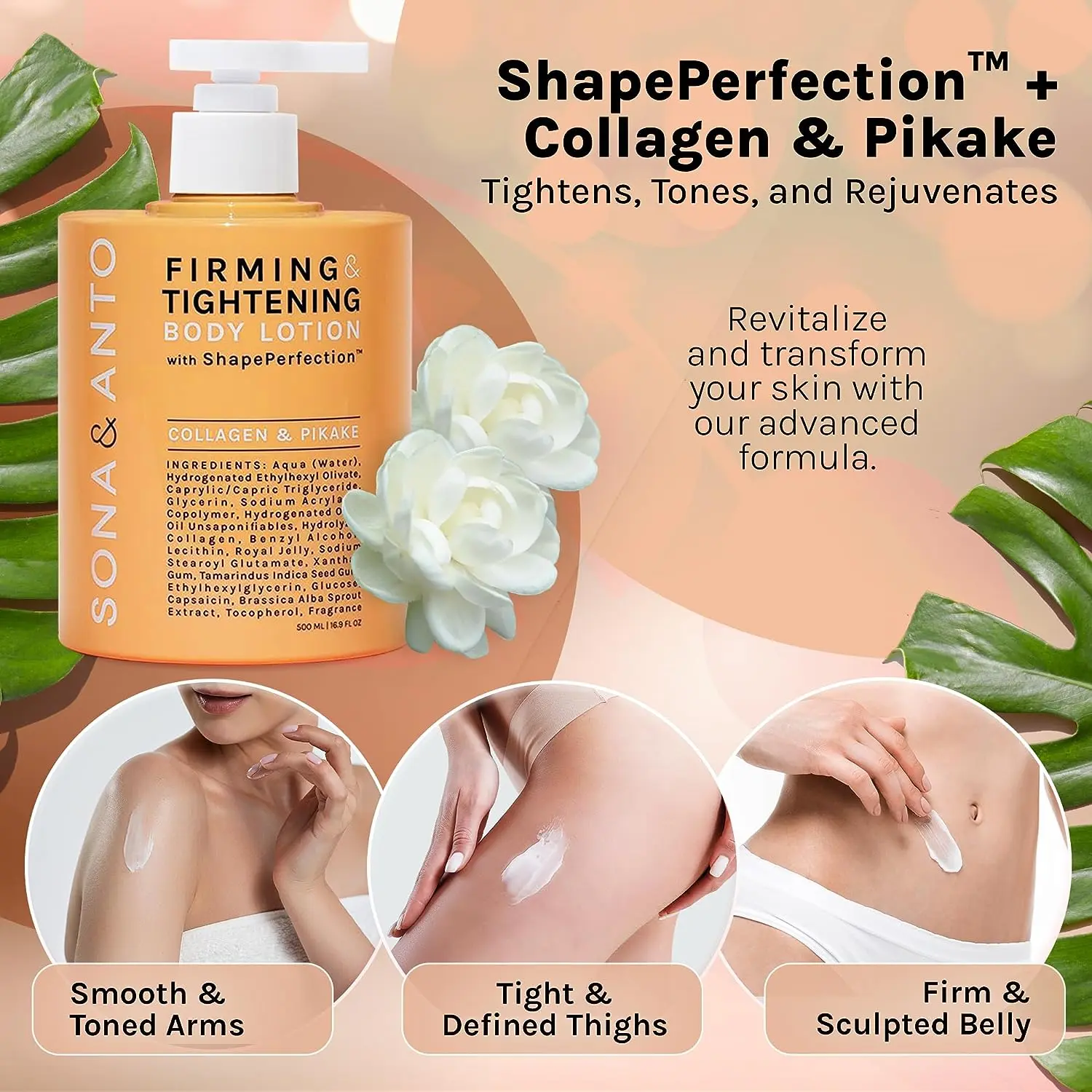 ·CLINICALLY TESTED - ShapePerfection is a liposoluble anti-cellulite slimming ingredient with mustard sprout extract and natural capsaicin. It targets specific areas, activates microcirculation, and converts adipocytes into cells that support natural body processes. Clinical studies show reductions in waist, abdomen, and upper arm measurements and improved cellulite. With added collagen for skin tightening, ShapePerfection is the premium choice for women desiring firm, toned, cellulite-free skin.Sona & Anto Tightening and Firming Body Lotion utilizes ShapePerfection technology to target cellulite and promote a firmer, more contoured look. This innovative formulation is based on recent scientific discoveries in adipocyte biology, which revealed the transformation of white adipocytes into brown-like adipocytes that support heat production. ShapePerfection combines mustard sprout extract, natural capsaicin from chili peppers, and a sprout extract from the Brassica alba species. These ingredients activate microcirculation and induce the browning of adipocytes. By enhancing blood flow, combating water retention, and promoting the conversion of fat-accumulating adipocytes into cells that support cellular activity, this lotion helps improve the appearance of cellulite. Clinical studies conducted over 8 weeks showed significant reductions in measurements among participants who applied the lotion twice daily to their waist and abdomen areas. These reductions included the waist, abdomen, upper arm, and cellulite appearance. Our clinically tested body lotion is made in France by Sona & Anto with ShapePerfection Technology. It aims to visibly reduce the appearance of cellulite and improve body contours, helping users achieve a slimmer silhouette and more contoured skin. Rediscover your skin's full potential and embrace the power of ShapePerfection everywhere. Elevate your skincare routine with Sona & Anto today!
