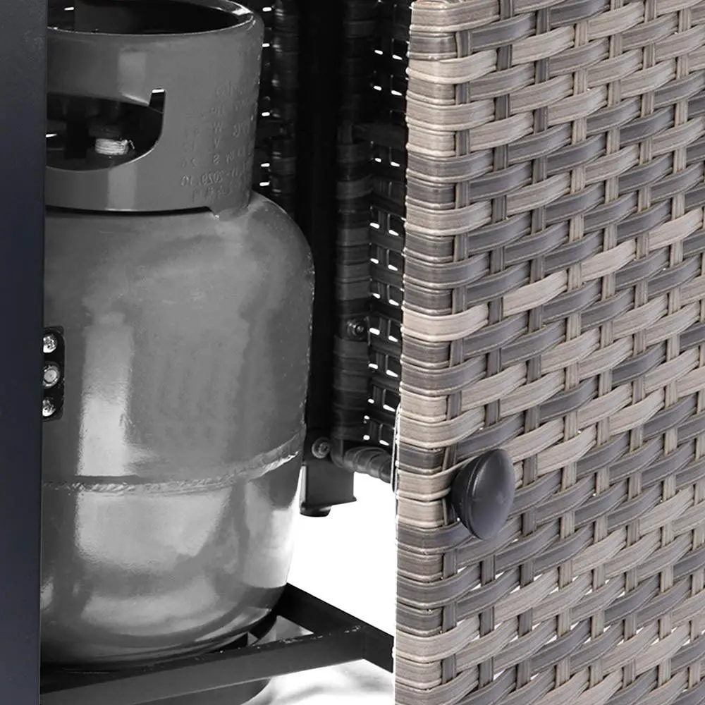 Grill Tank Not included Burning Area Material Stainless Steel Exterior Material Wicker + powder-coated steel Finish Metal Steel Fuel Type Propane Burn Time of Fuel Accommodated 6 hours Ignition Type Electronic ignition, control knob Adjustable Flame Yes BTU Output 50,000 BTU Filler Accommodated Lava rocks Filler Included Yes Weather Resistant Yes Cover Included Yes Product Care Do not pressure wash Location Outdoor Use Only Hidden Fuel Tank Yes Product Shape Rectangle Gas Tank Size Accommodated 20 lbs. Assembly Required