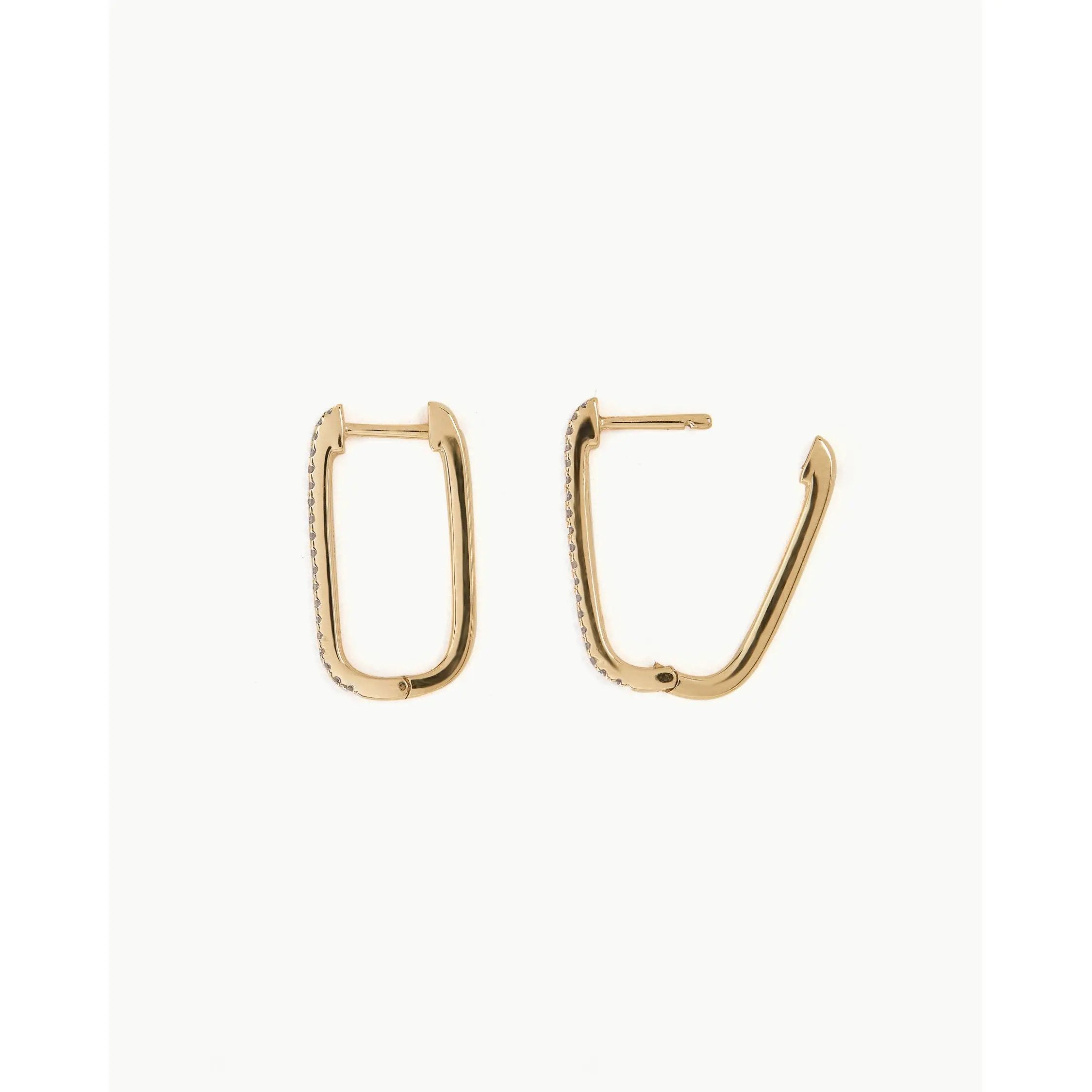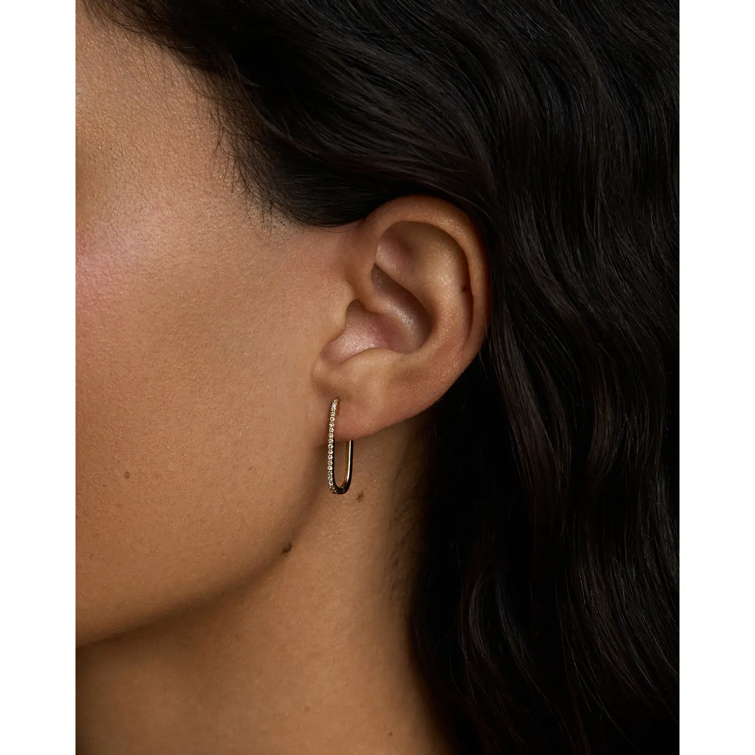 The unique addition to any ear stack will not go unnoticed with the Pave Paperclip Earrings. This beautiful, 14k gold paperclip-shaped hoop features natural diamonds and will undoubtedly turn heads with the non-traditional, modern shape it offers. Add these to your second or third holes in your ear ensemble to make for a sculpturally sound and understated sparkly look. Available in a smaller size here.