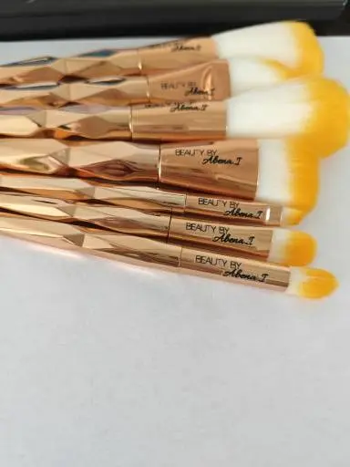A 7-piece brush set with orange diamond-shaped handles. Made with synthetic fibers. Includes the following brushes