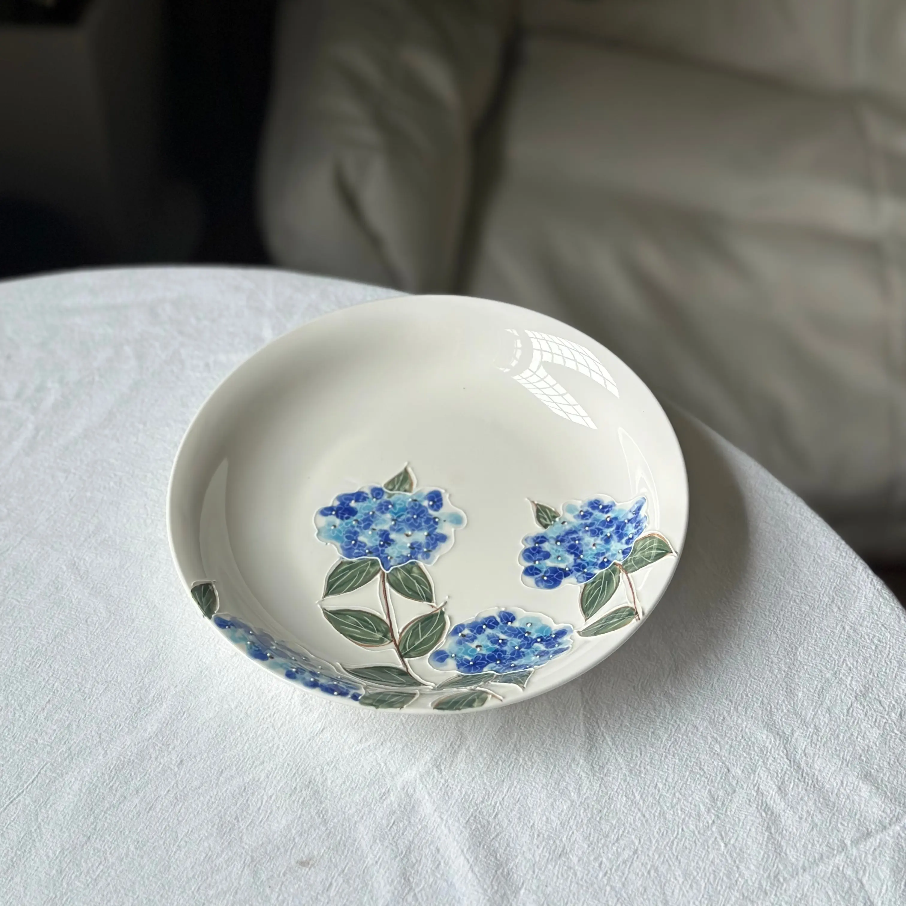 Handmade pottery plate with blue Hydrangea. Flower ceramic tableware. Birthday, wedding, festival gift.