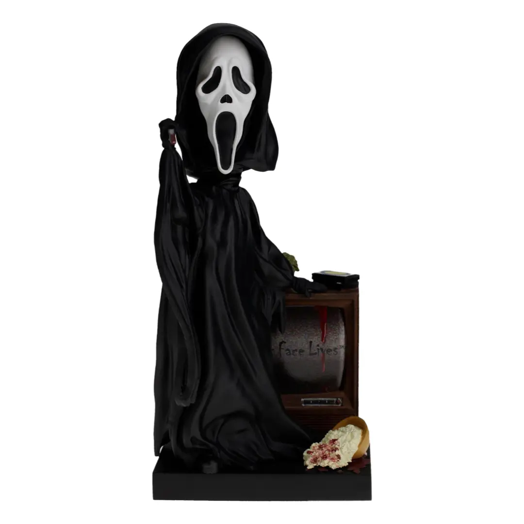 Why the long face? This bobblehead features Ghost Face with a bloodied knife standing in front of a tube television with verbiage reading "Ghost Face Lives." But you might want to pass on the popcorn...we don't think that's a cherry drizzle.