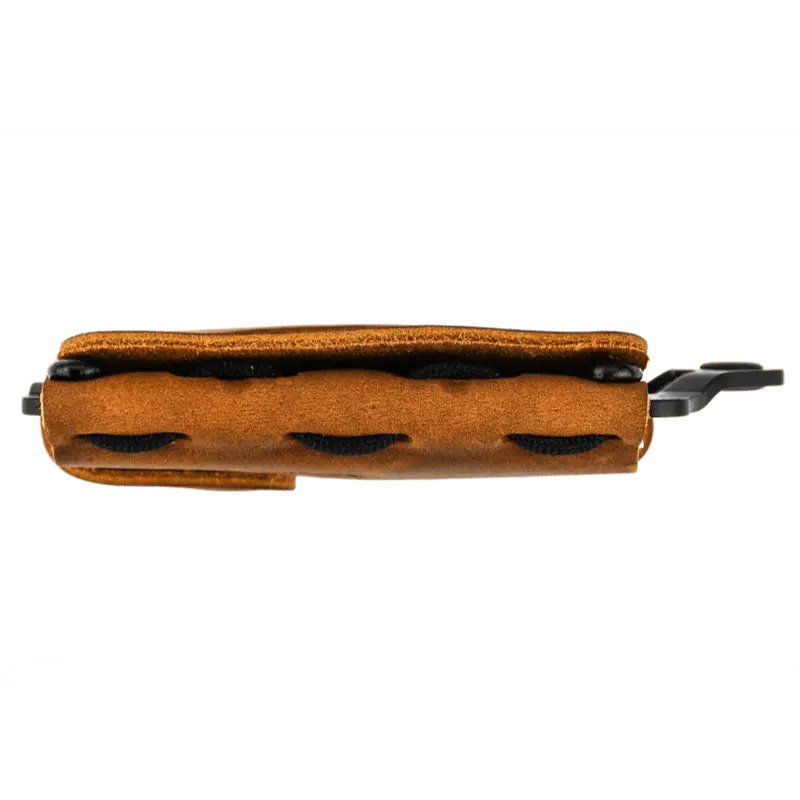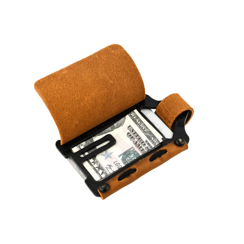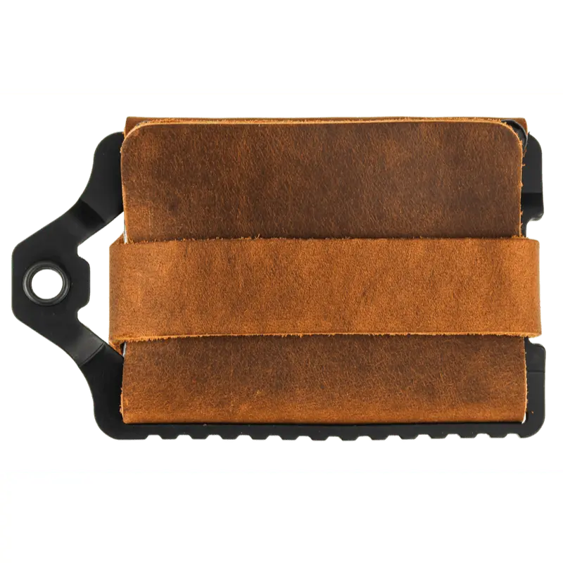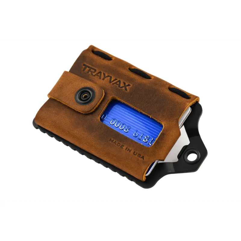 The Trayvax Element in Black Tobacco Brown, offers a rugged take on a classic leather wallet . We begin with a tough stainless-steel plate wrapped in top-grain oil-tanned leather and secured with MIL-SPEC paracord. This slim wallet is packed with features including a built-in bottle opener, integrated money clip, attachment point, and RFID-protection. The Element is slim enough to slip in your front pocket, tough enough for any outdoor pursuit, but stylish enough for date night or everyday carry.