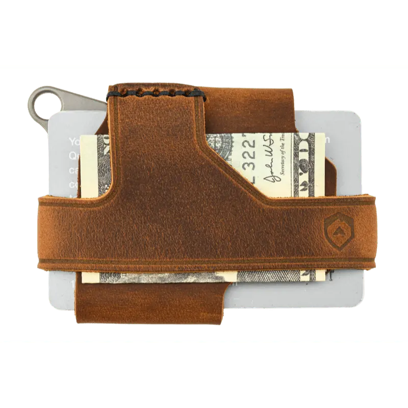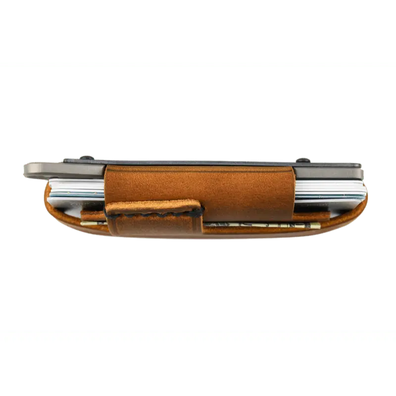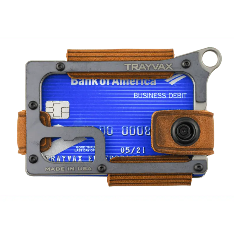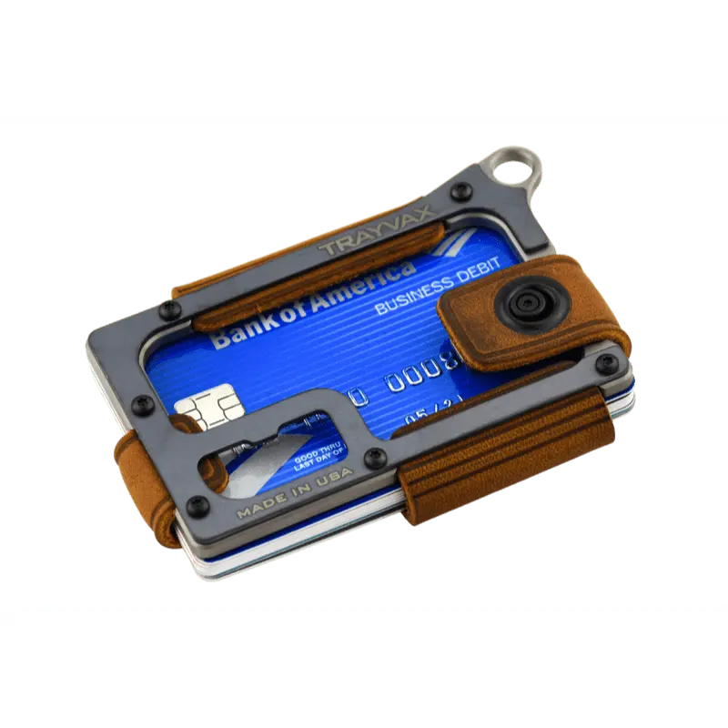 The Trayvax Contour in Titanium Tobacco Brown, is our most refined leather wallet to date. The bottom plate is highly-precise CNC-machined stainless-steel, brass, or titanium. The top plate is PVD-coated for durability. Each plate is wrapped in top-grain oil-tanned leather, which will develop a patina as a constant reminder of your journey. Ideal for use as a front-pocket wallet , the sleek design and slim profile ensures a compact and lightweight everyday carry.