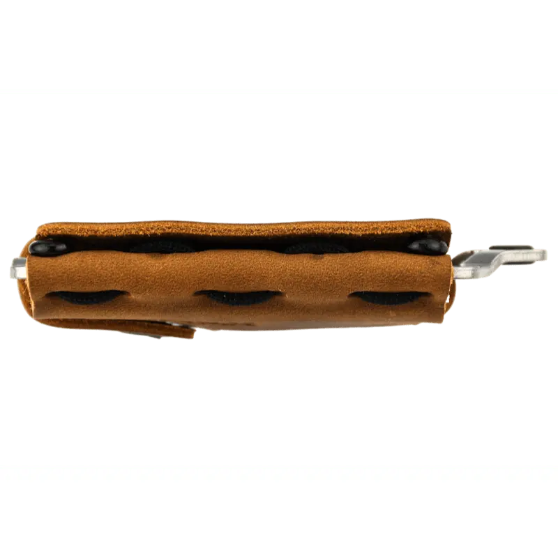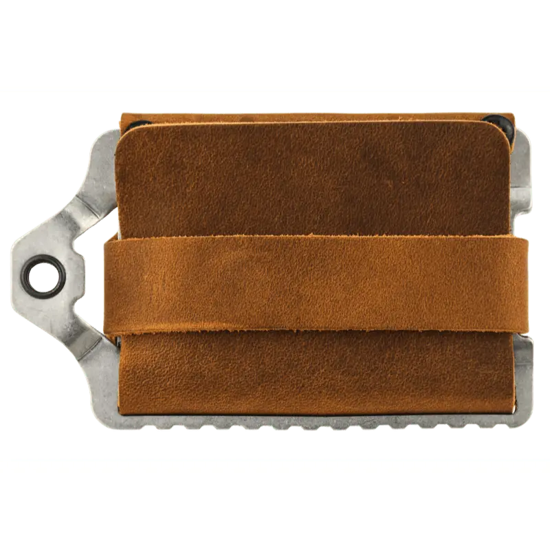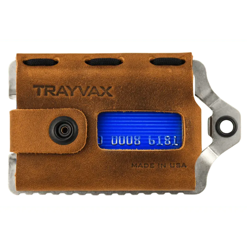 The Trayvax Element in Raw Tobacco Brown, offers a rugged take on a classic leather wallet . We begin with a tough stainless-steel plate wrapped in top-grain oil-tanned leather and secured with MIL-SPEC paracord. This slim wallet is packed with features including a built-in bottle opener, integrated money clip, attachment point, and RFID-protection. The Element is slim enough to slip in your front pocket, tough enough for any outdoor pursuit, but stylish enough for date night or everyday carry.