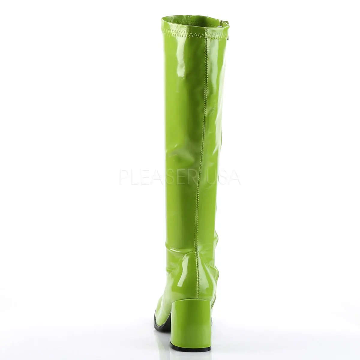 The retro inspired GOGO300 lime green pat knee high boot features a 3" block heel, stretch faux patent uppers and a side zipper. These boots will be the perfect compliment to you Gogo Dancer costume! Sizes are in Womens.